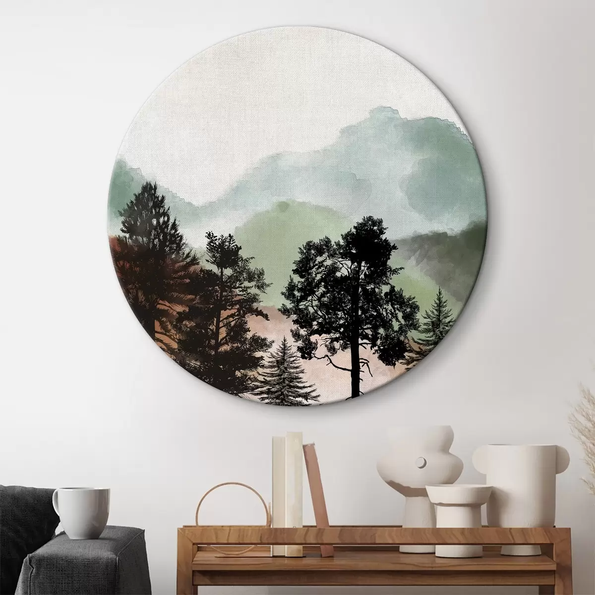 Runde Wandbilder Aquarell Berglandschaft mit Bäumen r36603
