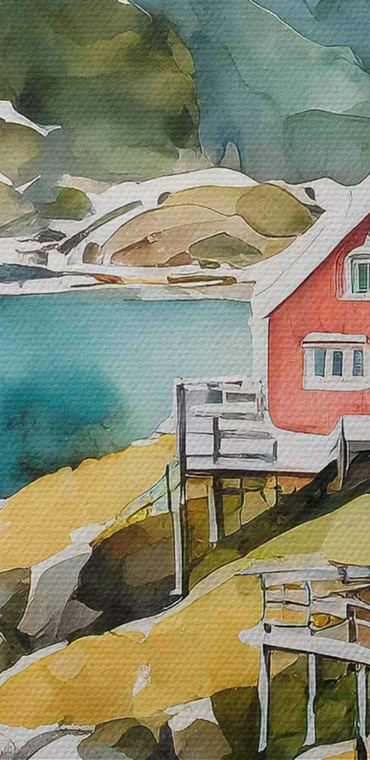 Runde Wandbilder Aquarell von Häusern auf einem Hügel neben einem Stausee r36678
