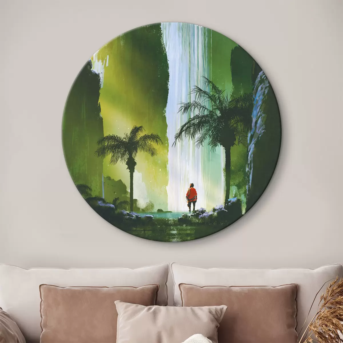 Runde Wandbilder Ein Mann spaziert durch den Wald mit einem Wasserfall Nr r37080