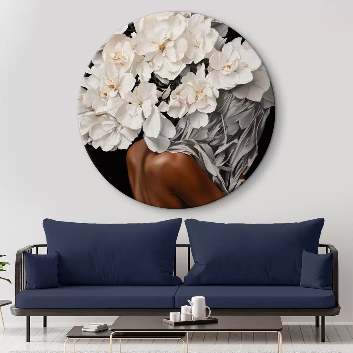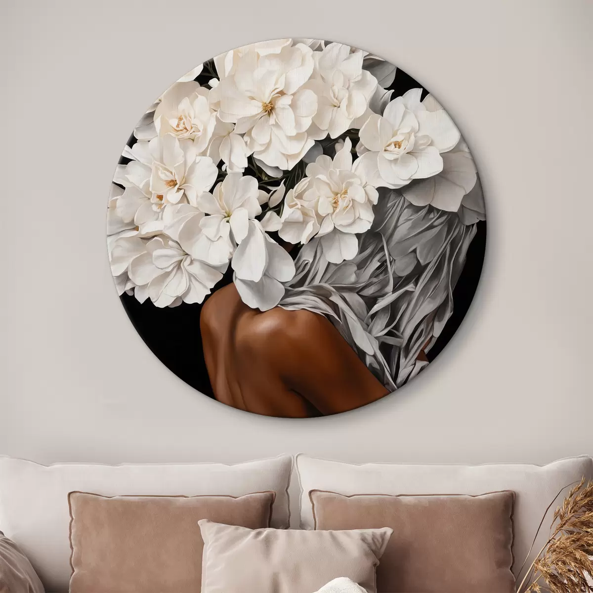 Runde Wandbilder Frau mit weißen Blumen auf schwarzem Hintergrund r37163