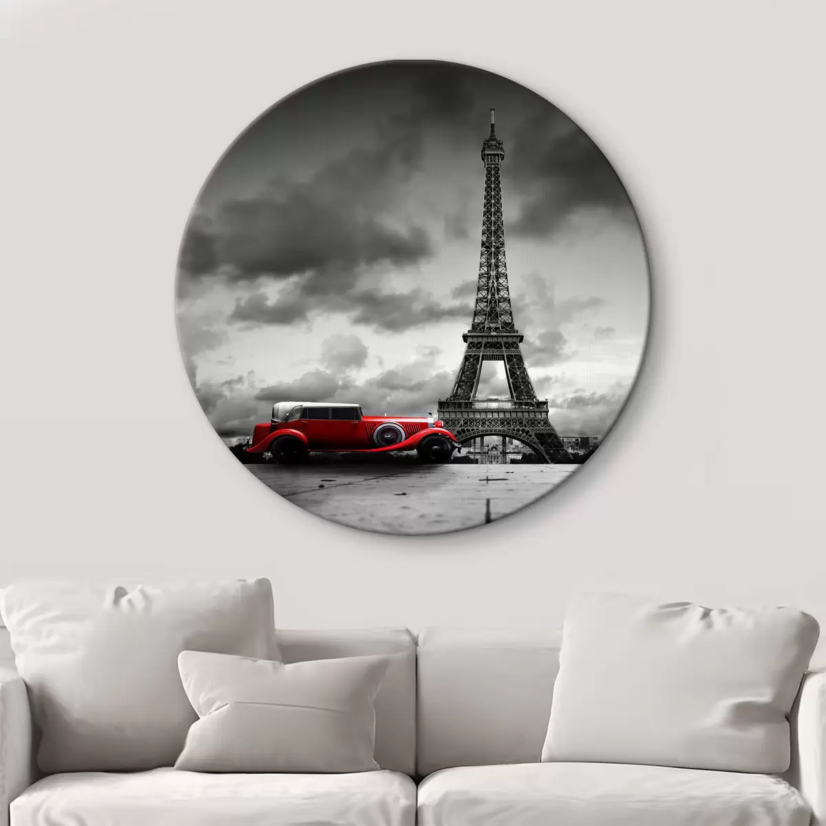 Runde Wandbilder Rote Retro-Auto auf dem Hintergrund von Paris r37481