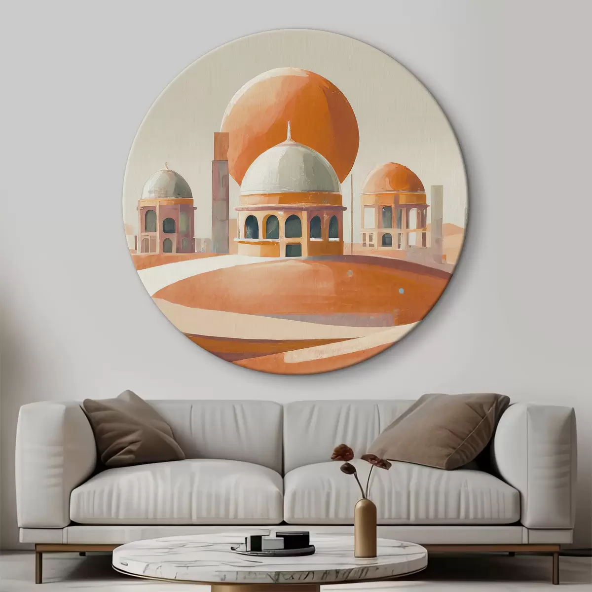 Runde Wandbilder Wüstenlandschaft mit Gebäuden und einem großen orangefarbenen Ball Nr r37812