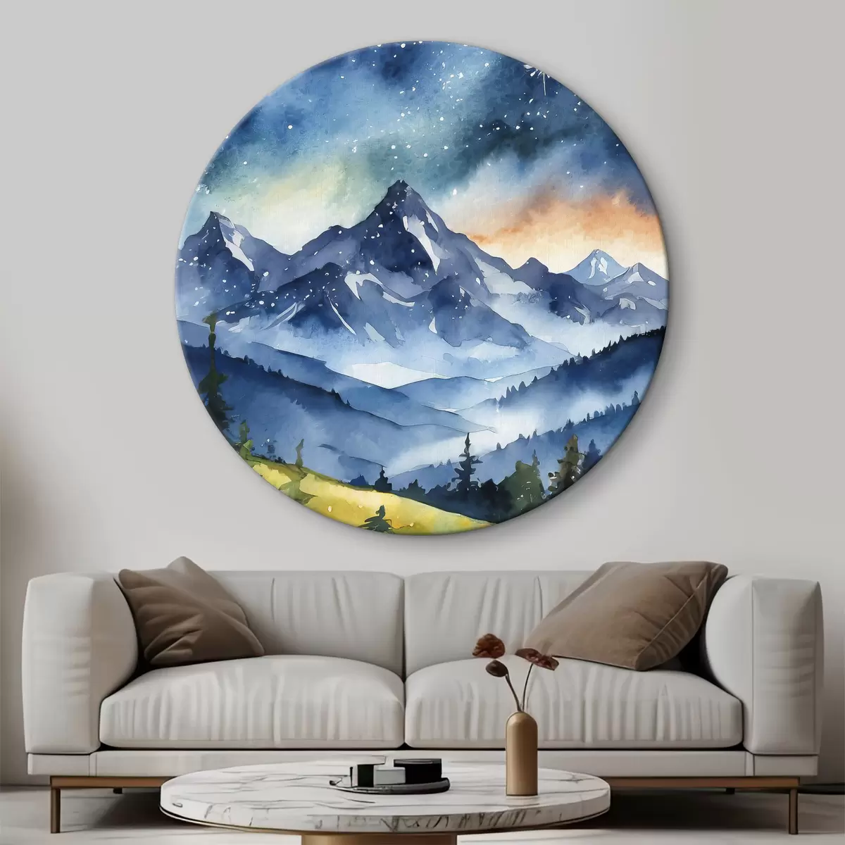 Runde Wandbilder Aquarell Berglandschaft, Wald, sternenklarer Nachthimmel, Sonnenuntergang Farben Nr r37946