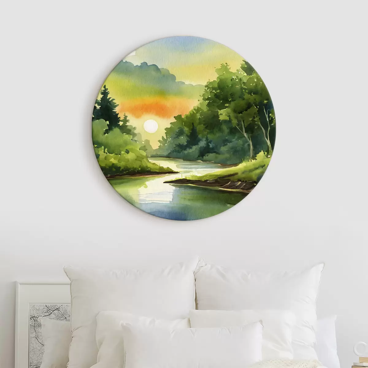 Runde Wandbilder Sonnenuntergang am Fluss, Wald, Aquarell, Sonnenuntergang, grün, Natur Nr r37949