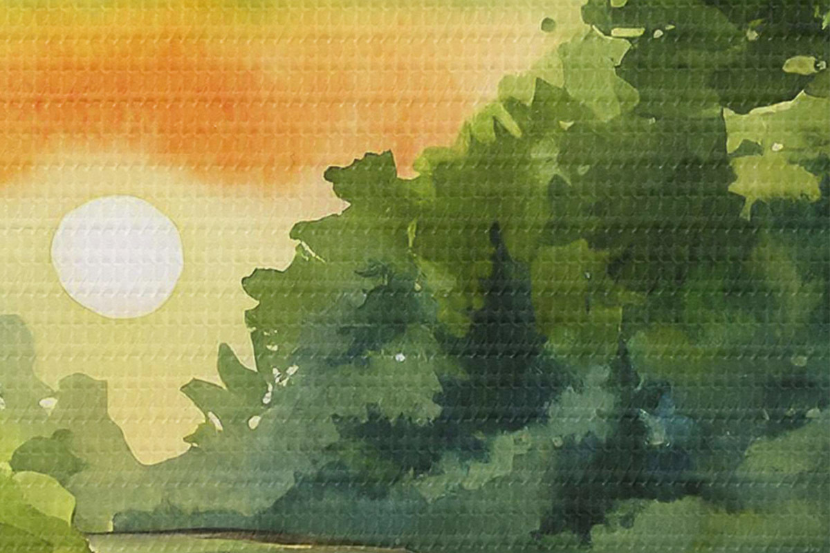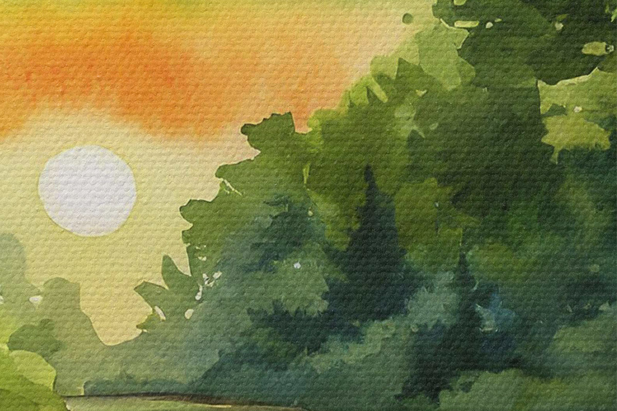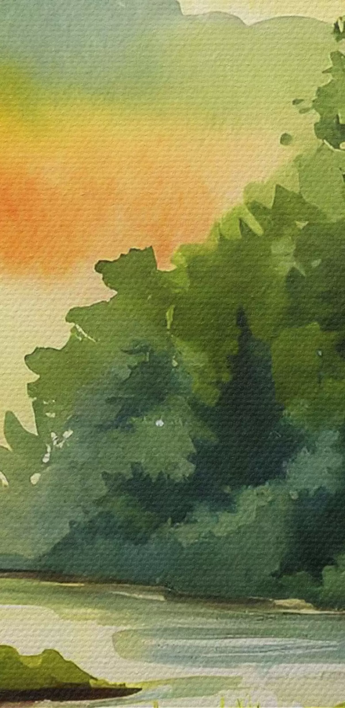 Runde Wandbilder Sonnenuntergang am Fluss, Wald, Aquarell, Sonnenuntergang, grün, Natur r37949