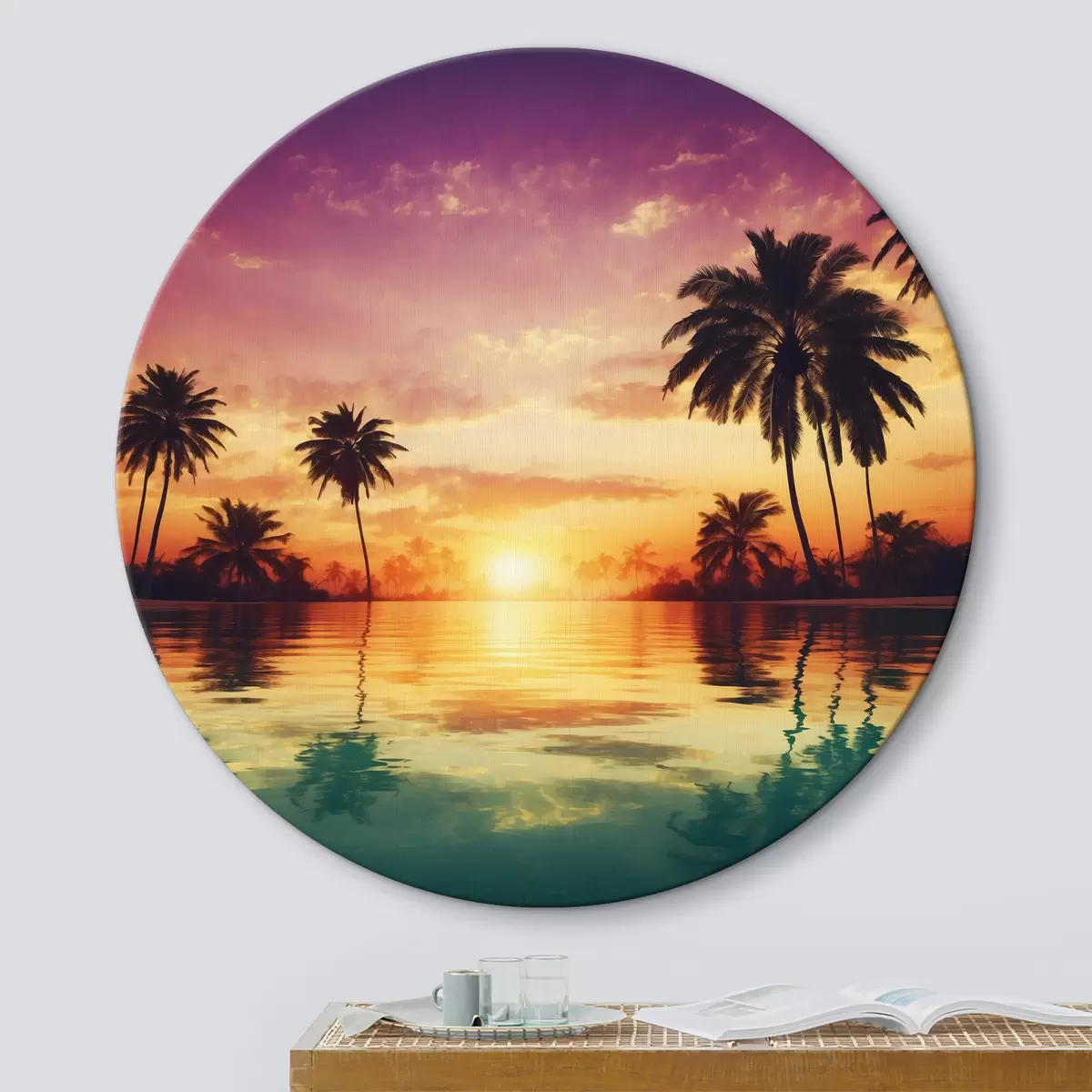 Runde Wandbilder Sonnenuntergang über einem Stausee mit Palmen Nr r38183