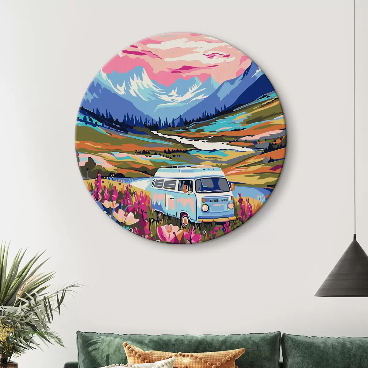 Runde Wandbilder Ein Lieferwagen fährt durch ein Blumenfeld Nr r38260