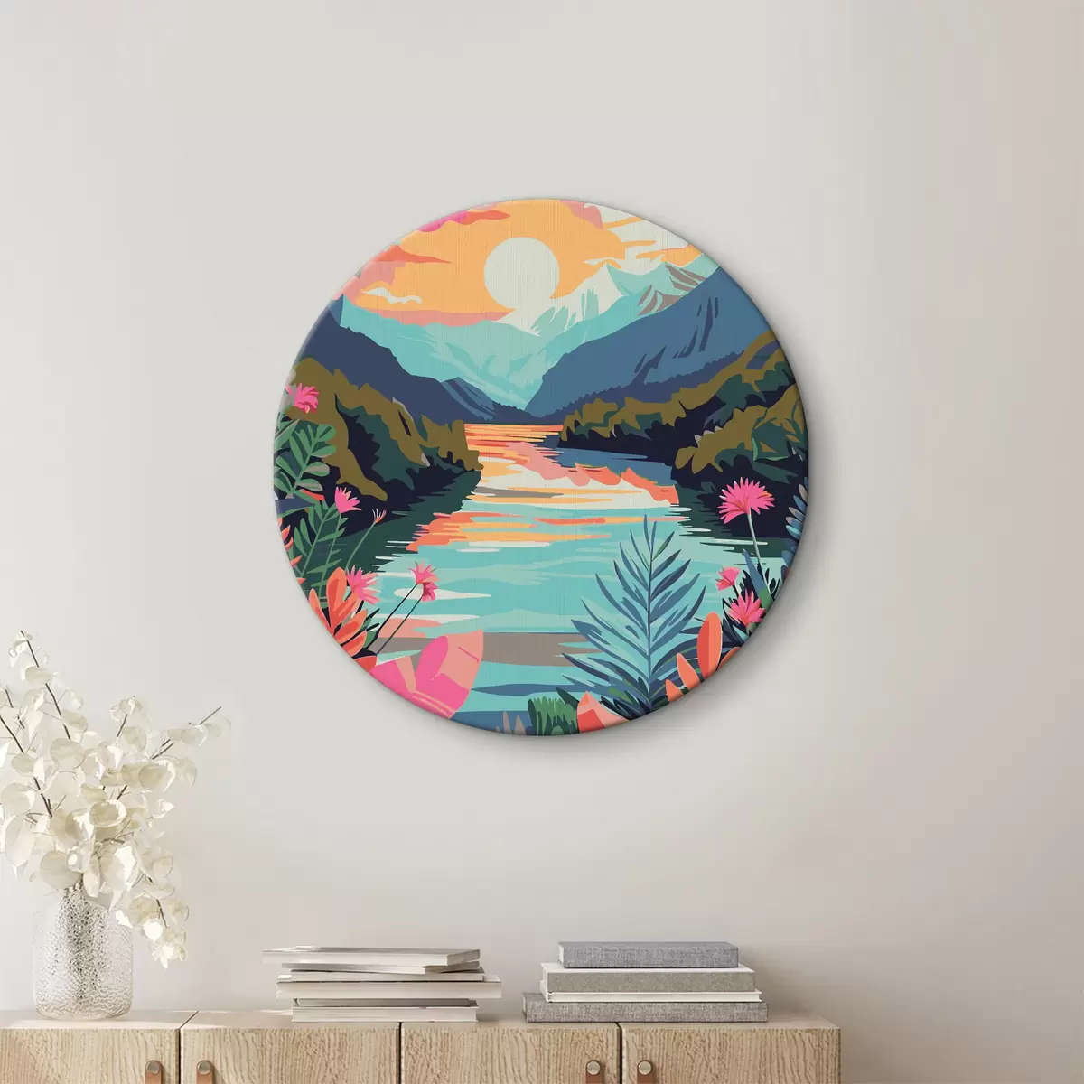 Runde Wandbilder Fluss mit Blumen und Bergen im Hintergrund Nr r38266