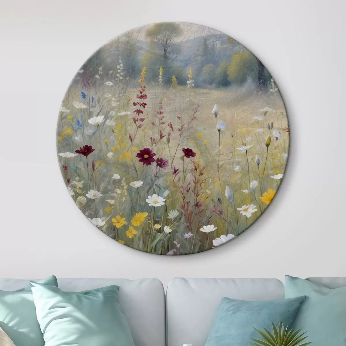 Runde Wandbilder Eine bunte Wiese mit Wildblumen mit einem verschwommenen Wald im Hintergrund Nr r38368