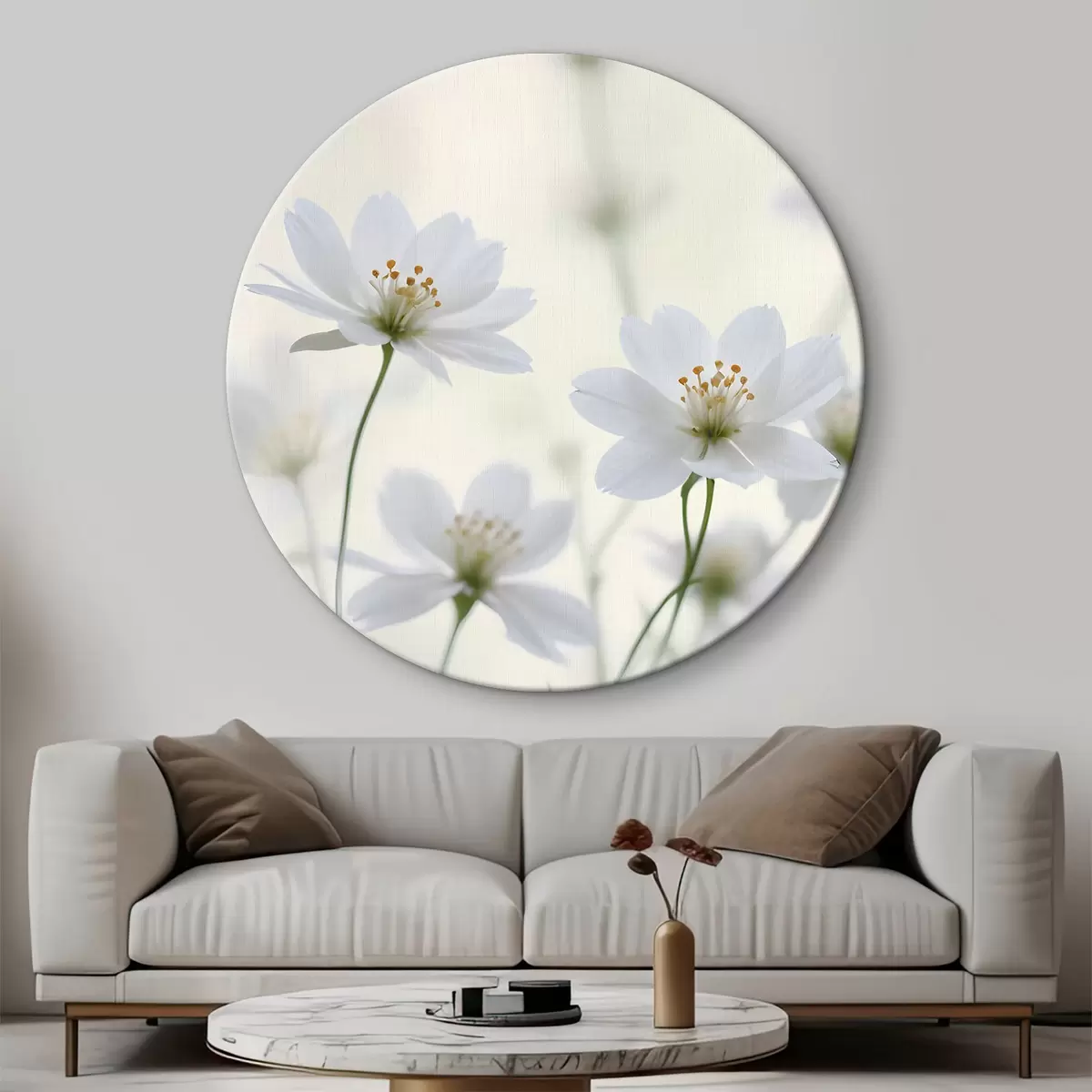 Runde Wandbilder Weiße Gänseblümchen auf einem Feld mit einem weichen, unscharfen Hintergrund r38370