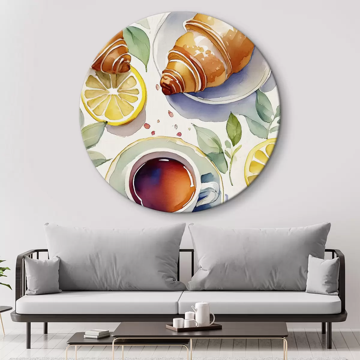 Runde Wandbilder Croissant Aquarell, Tasse Tee, Frühstück, Zitronen, rustikaler Stil Nr r38389