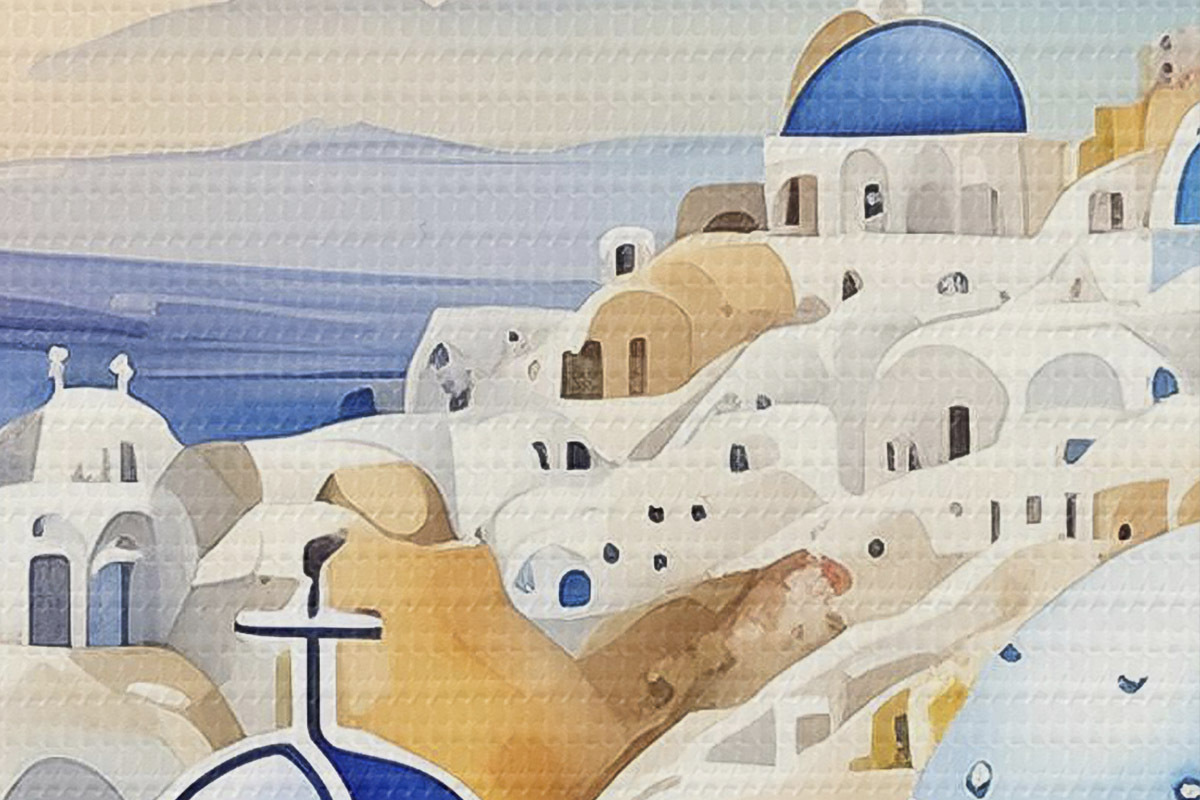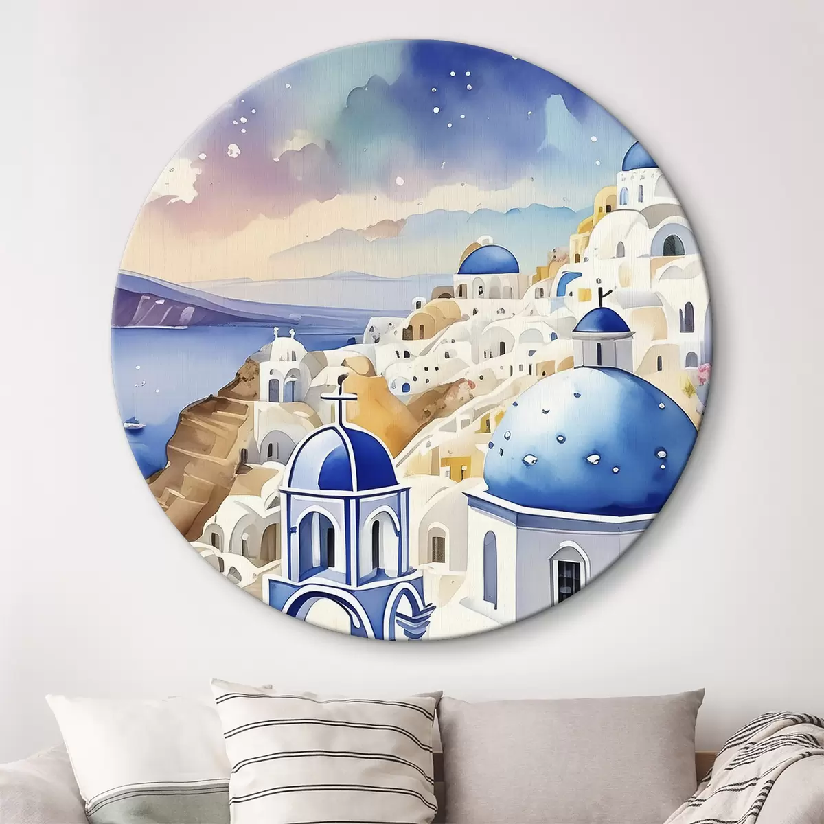 Runde Wandbilder Santorini, Griechenland, Architektur, Aquarell, Blumen, Mittelmeerküste Nr r38401
