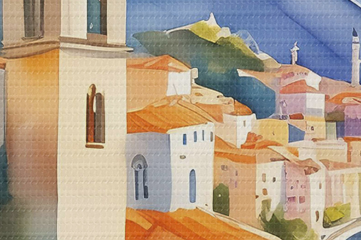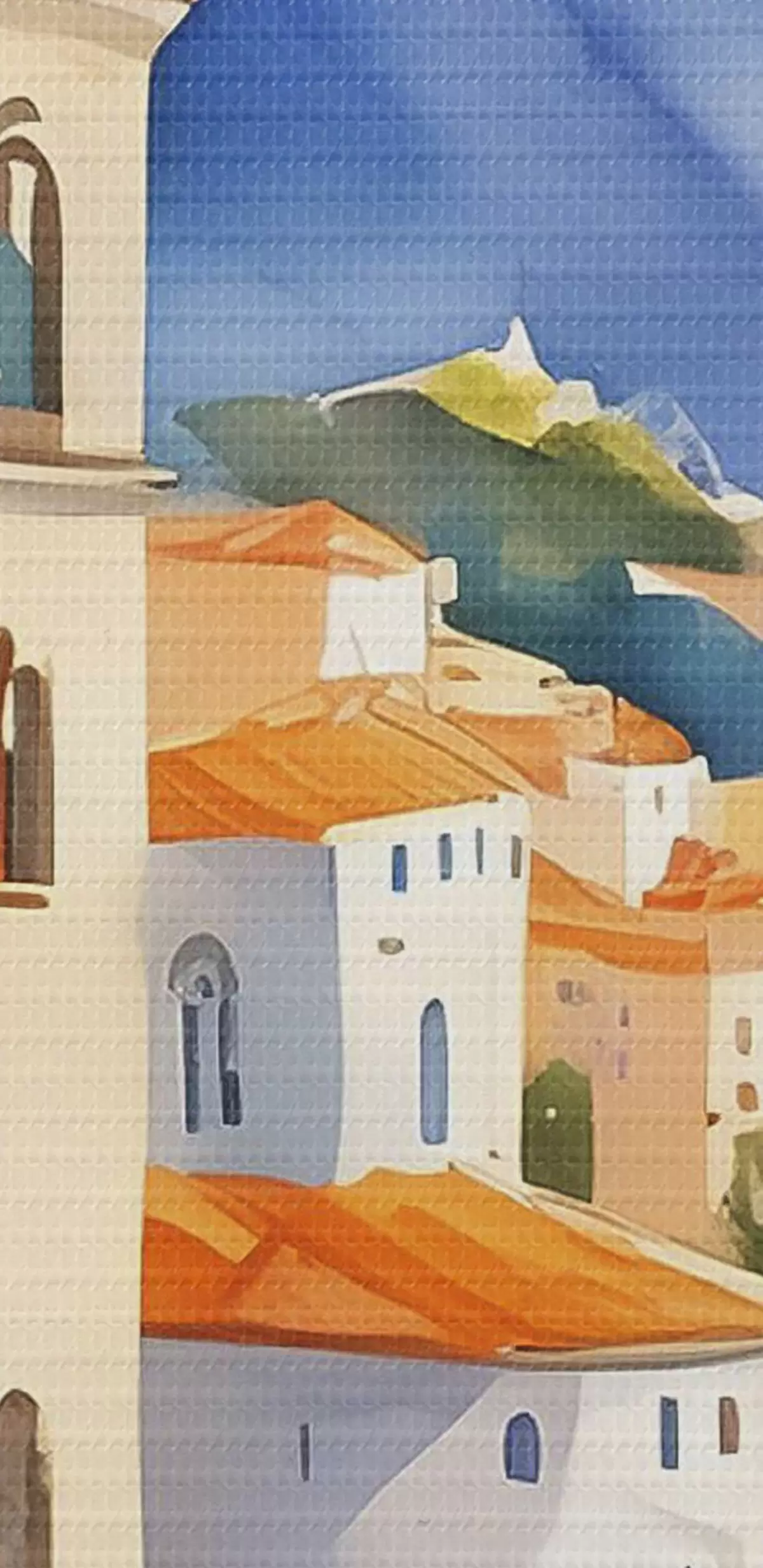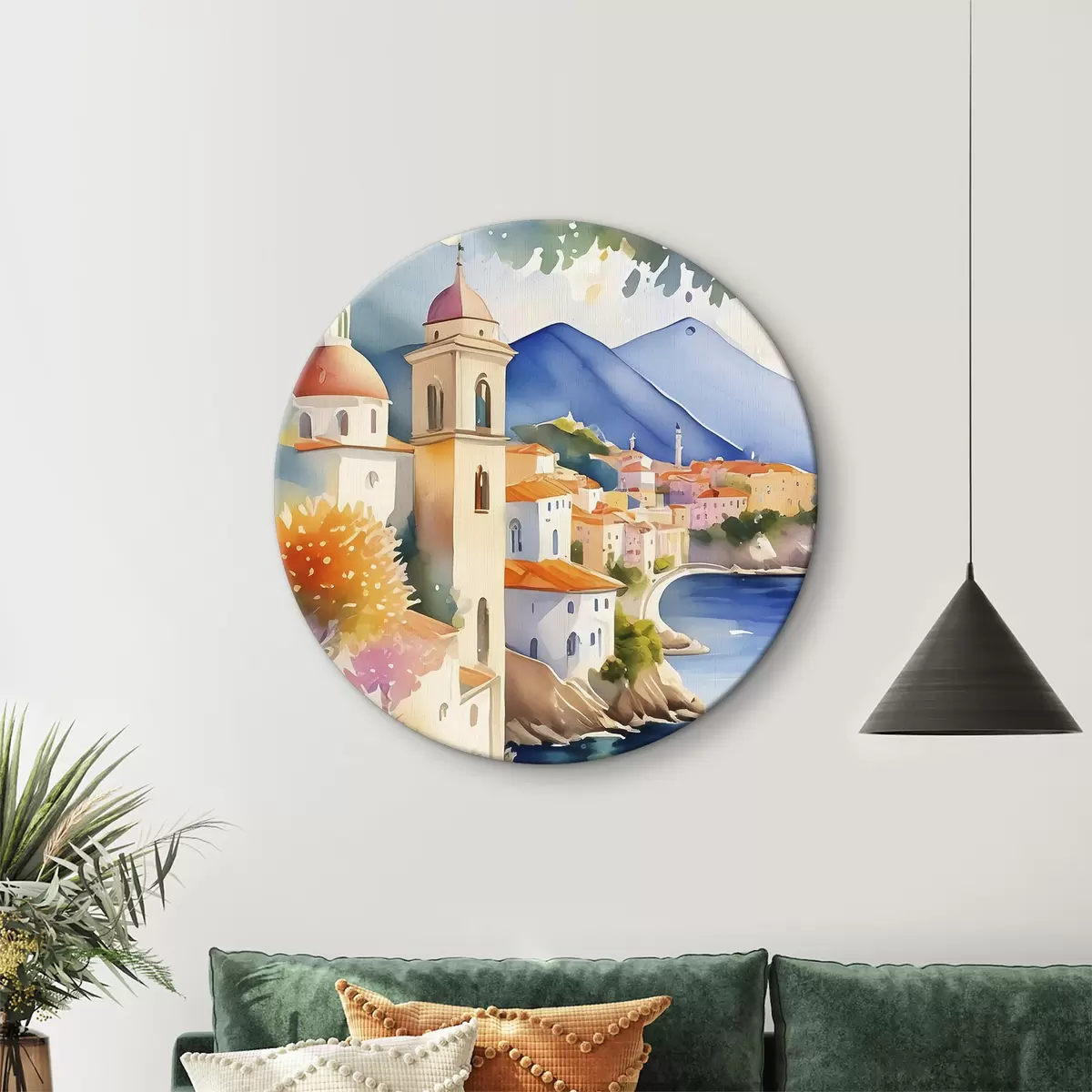 Runde Wandbilder Ein Aquarell, das eine Stadt am Rande eines Stausees zeigt Nr r38407