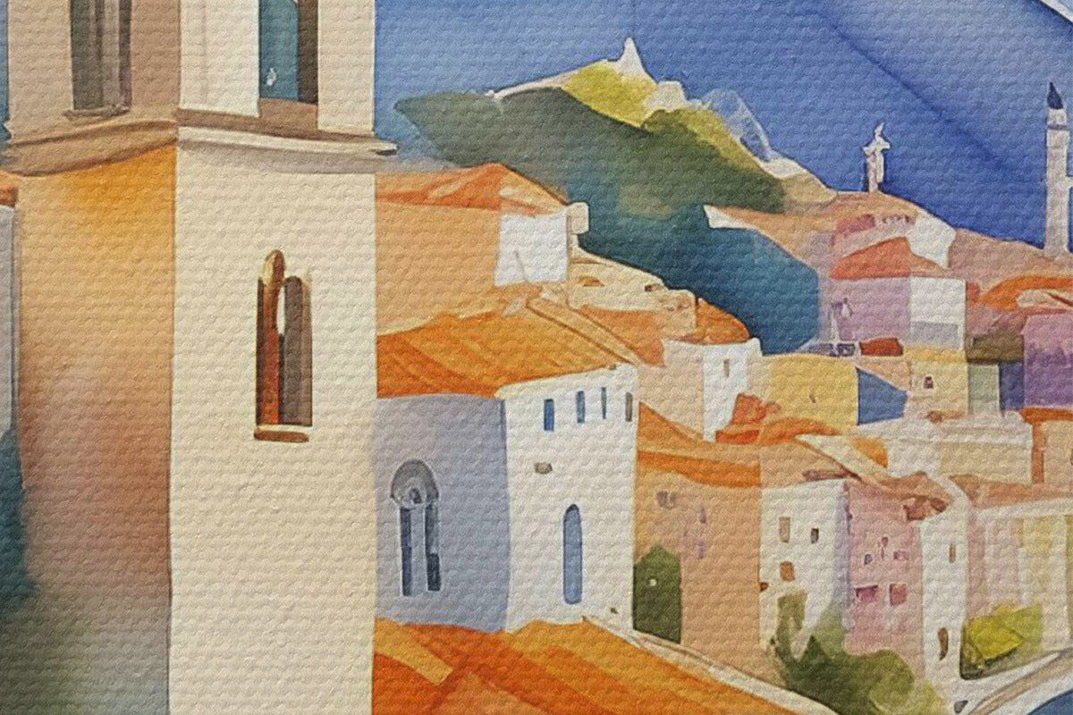 Runde Wandbilder Ein Aquarell, das eine Stadt am Rande eines Stausees zeigt r38407