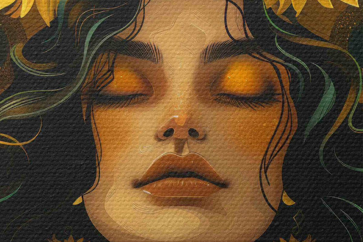 Runde Wandbilder Frau mit Sonnenblumen in ihrem Haar r38412