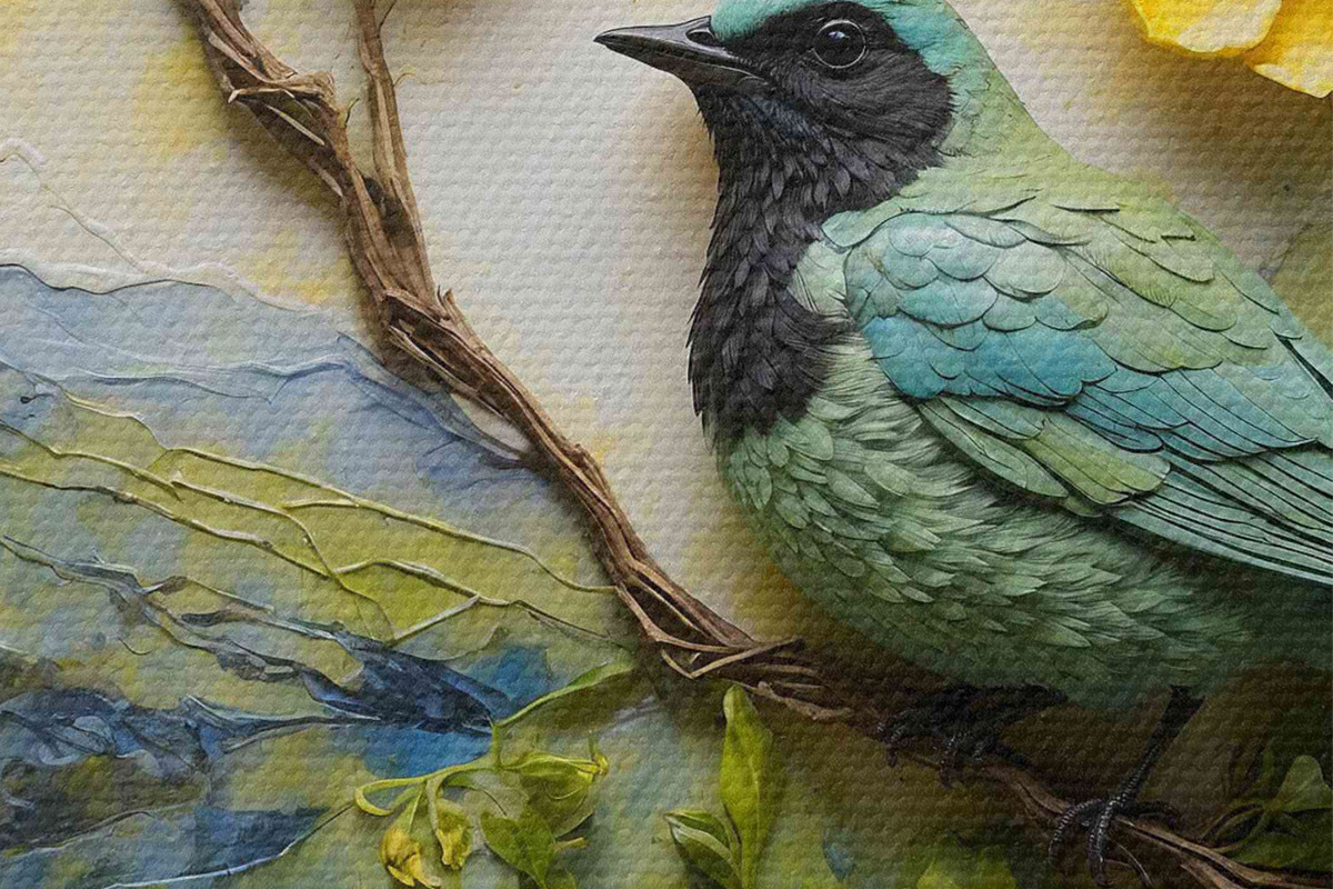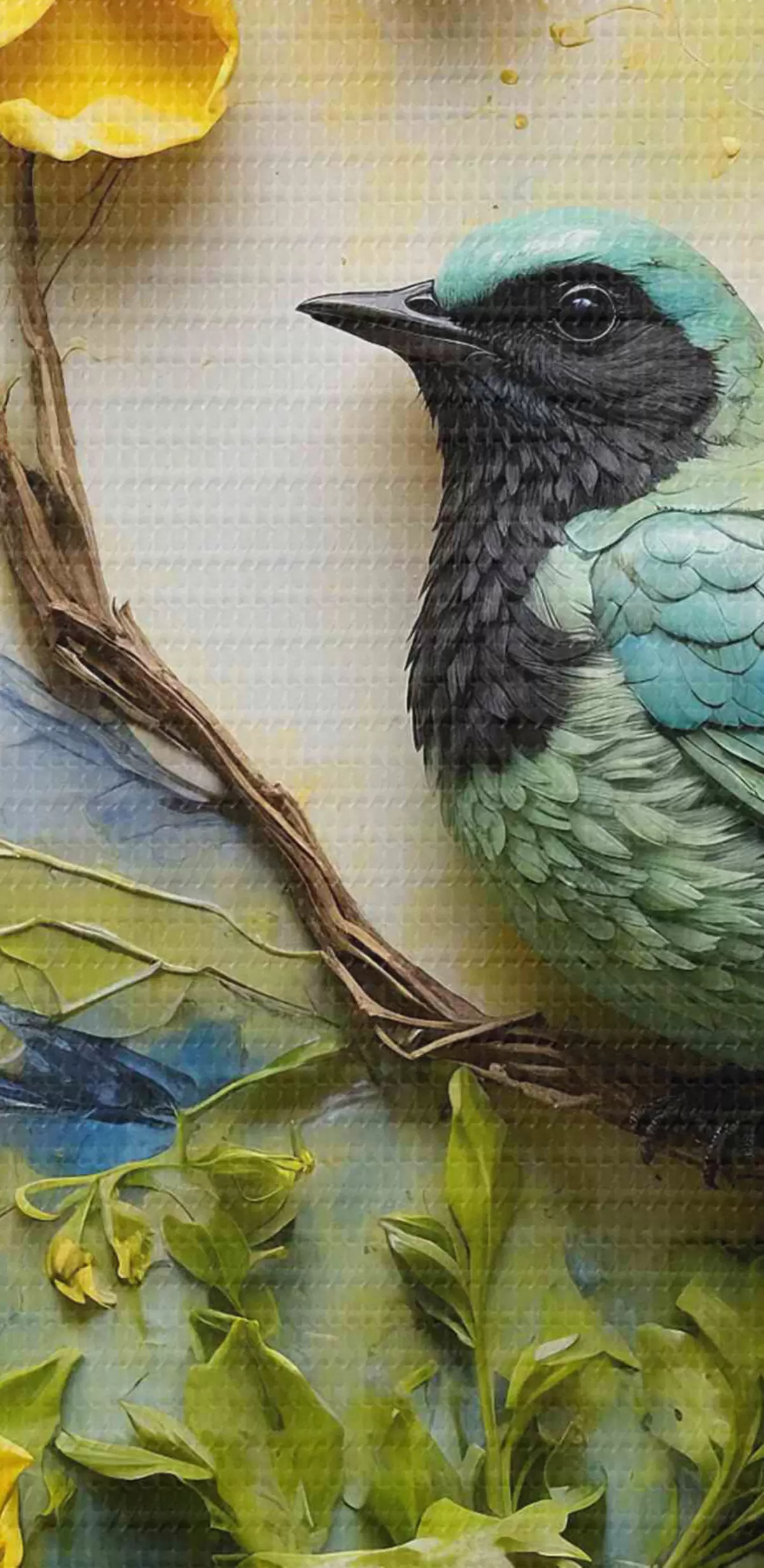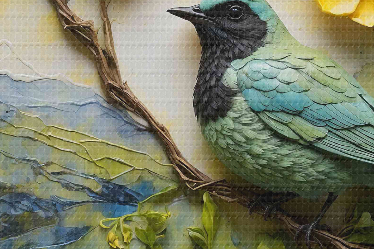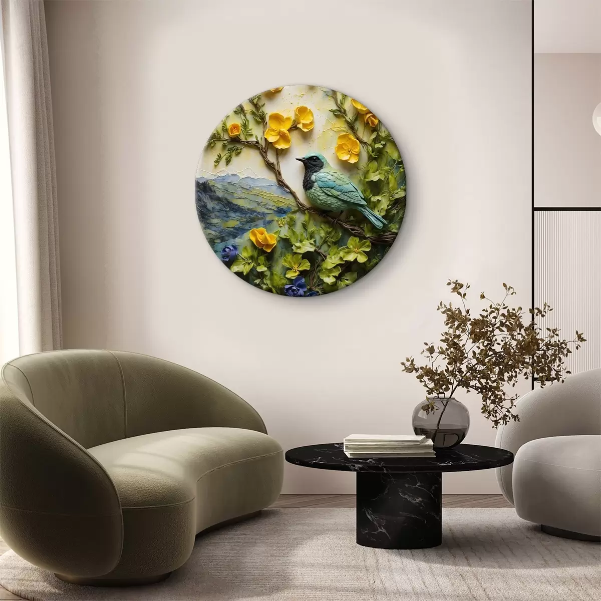 Runde Wandbilder Ein Vogel auf einem Ast, umgeben von Blumen r38431