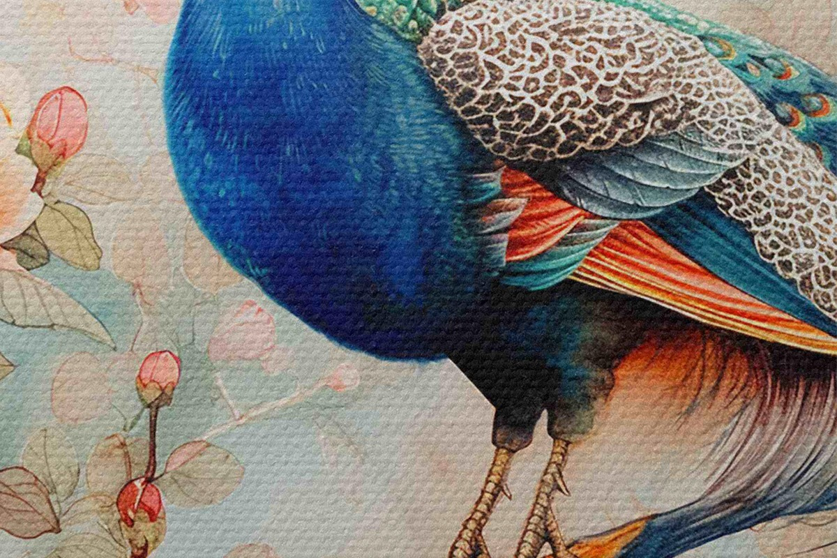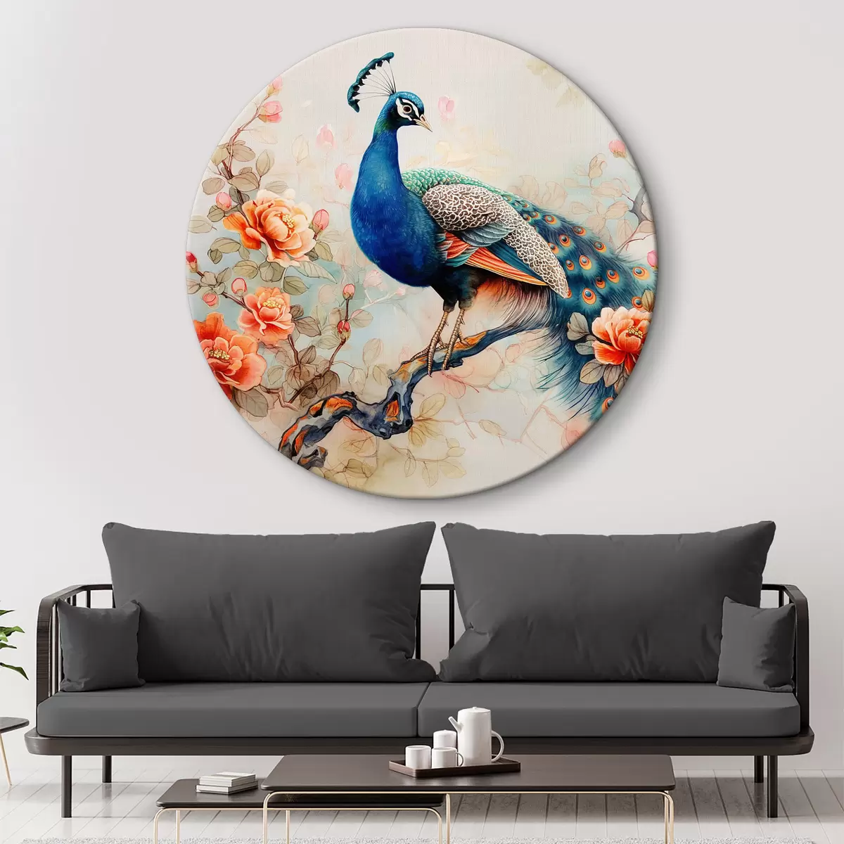 Runde Wandbilder Ein Gemälde, das einen Pfau auf einem Ast mit Blumen zeigt r38452