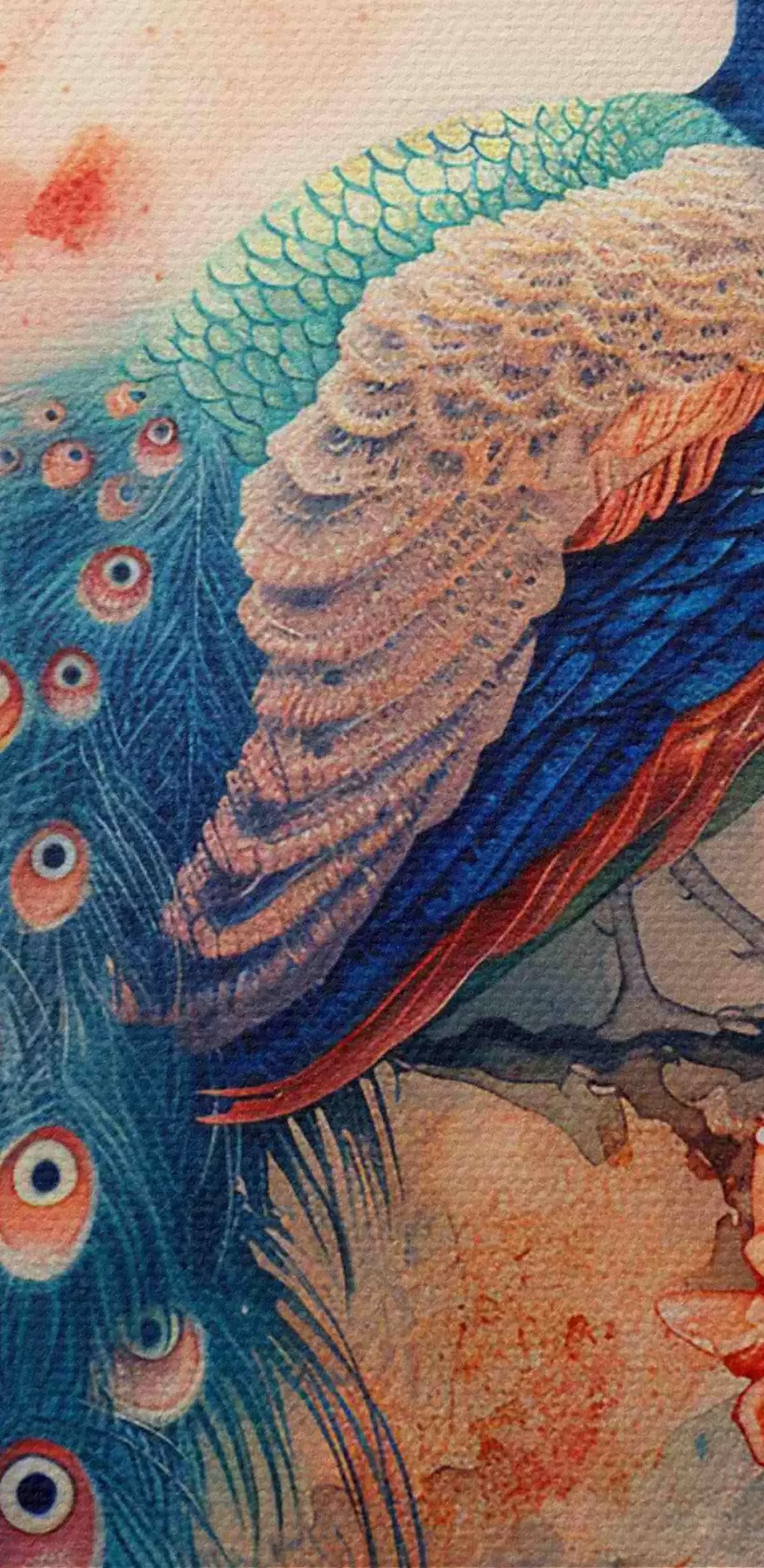 Runde Wandbilder Ein Gemälde, das einen Pfau auf einem Ast mit Blumen zeigt r38455