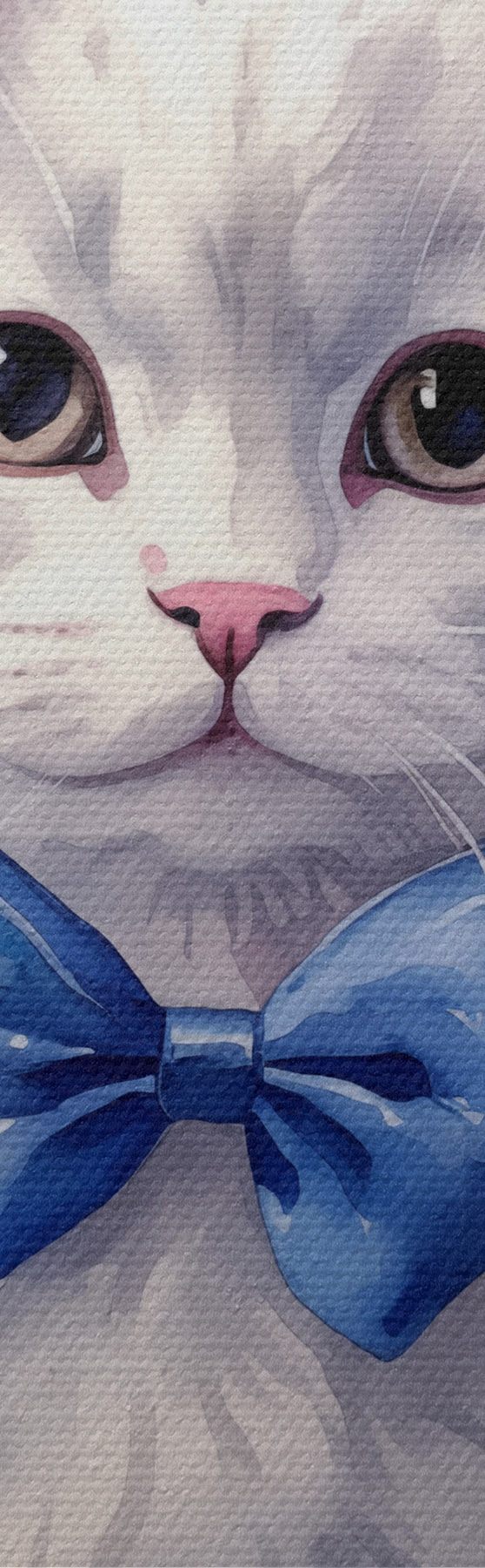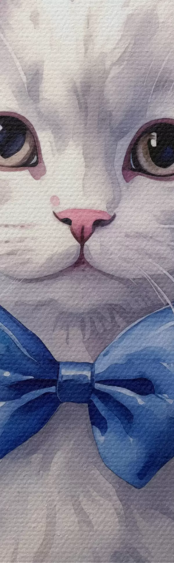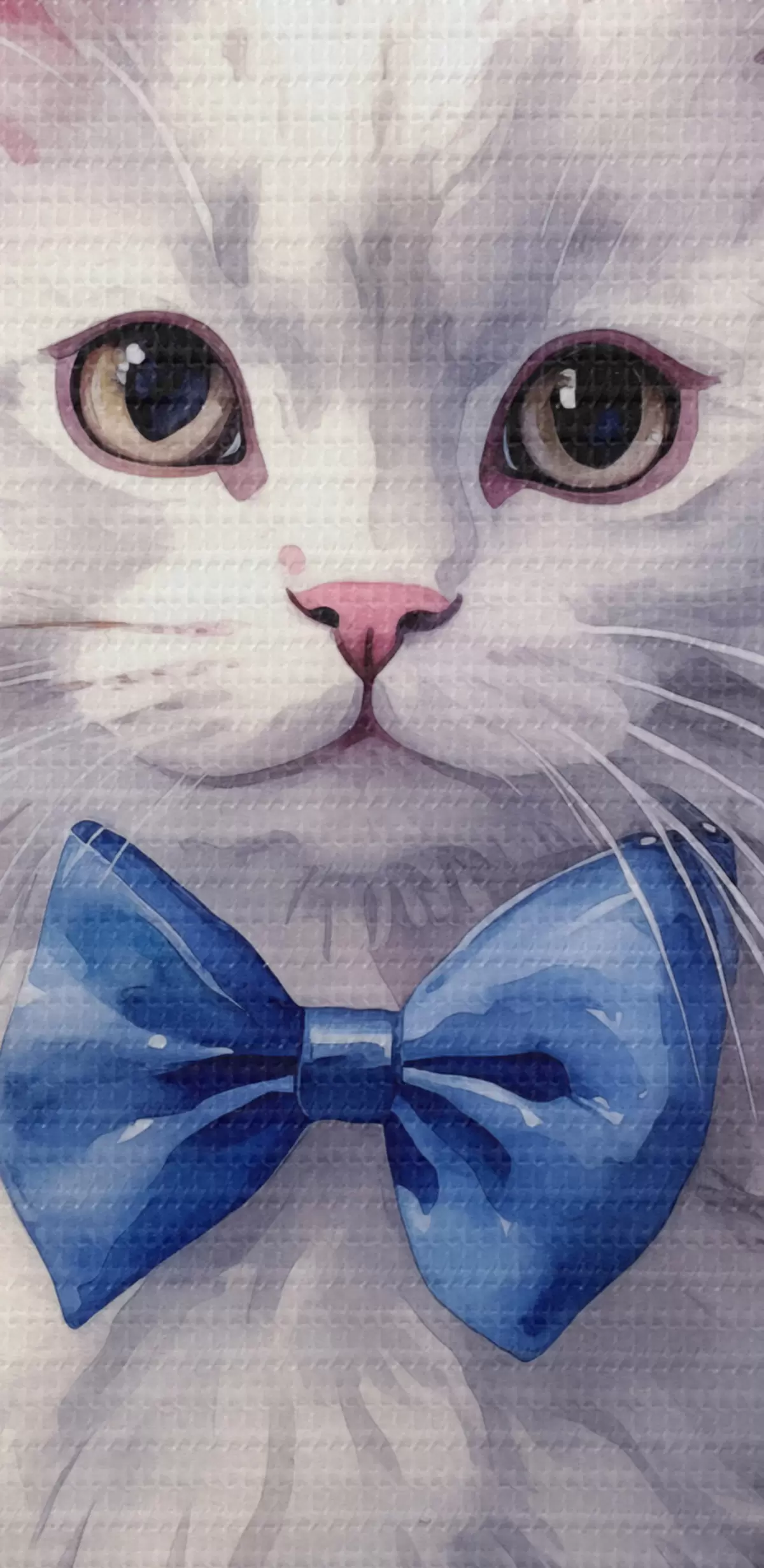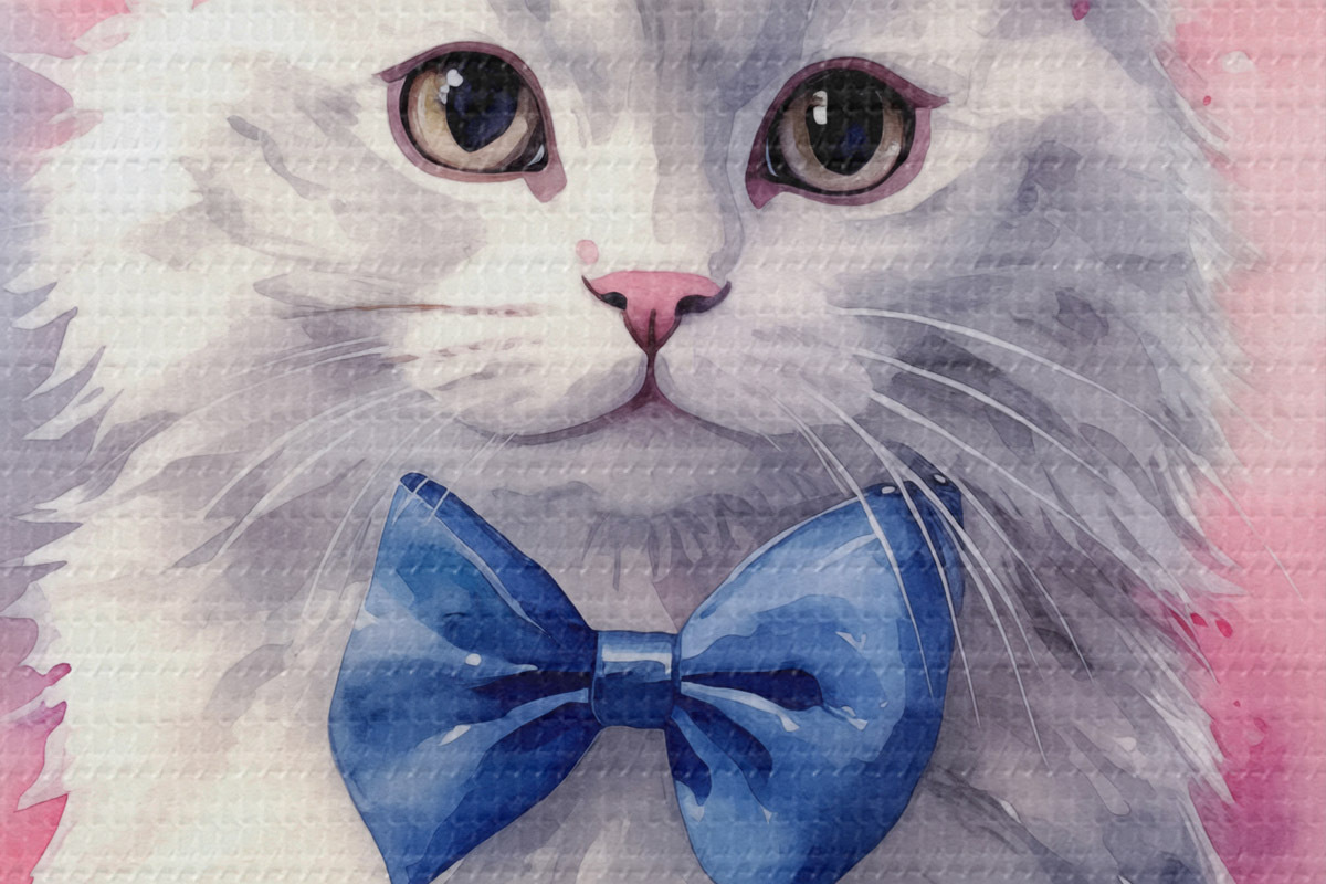 Runde Wandbilder Weiße flauschige Katze mit einer blauen Schleife am Hals, Aquarell, Tier, grau, weiß, rosa, blaue Farbe r38479