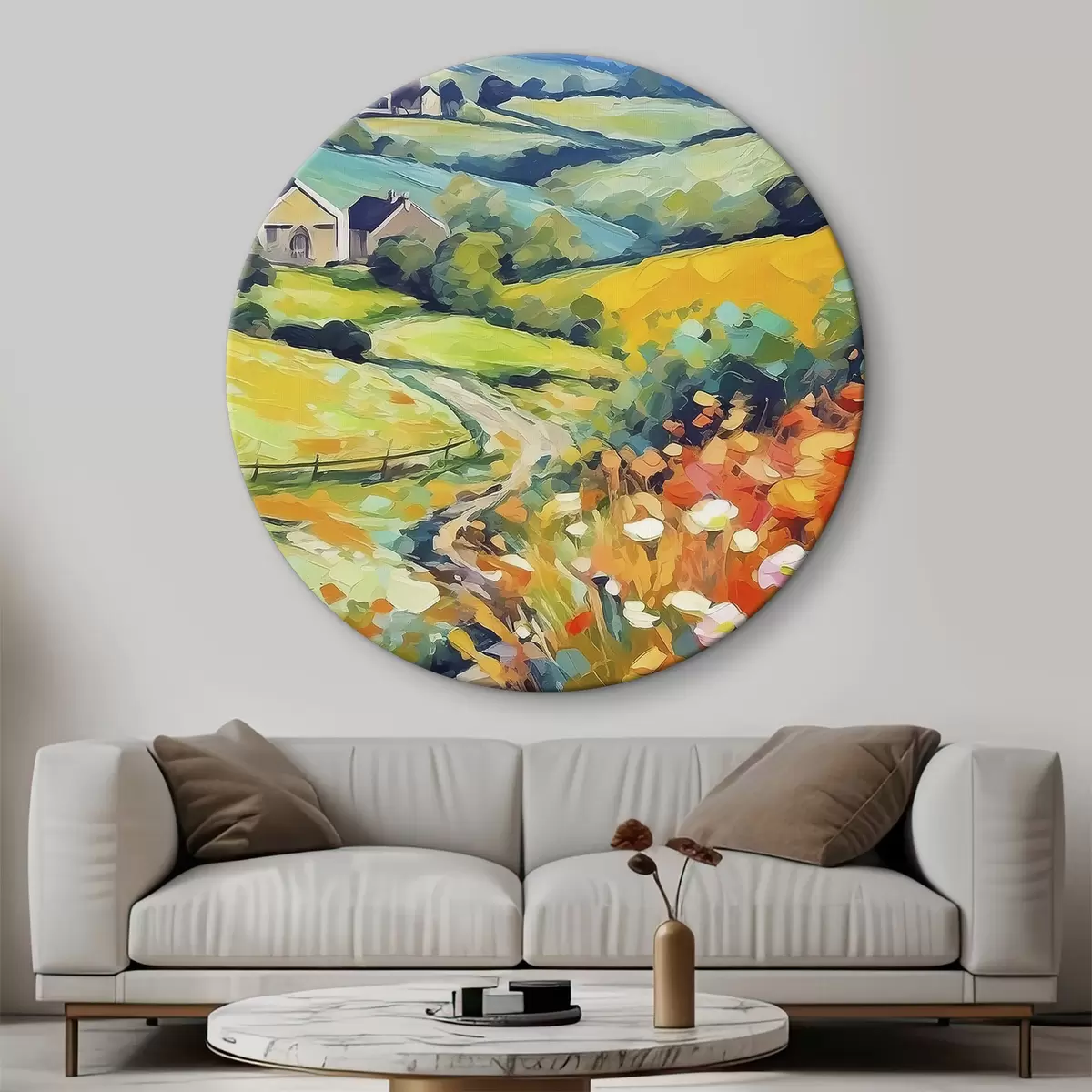 Runde Wandbilder Ein Gemälde, das eine Landschaft mit Häusern und Feldern zeigt Nr r38501