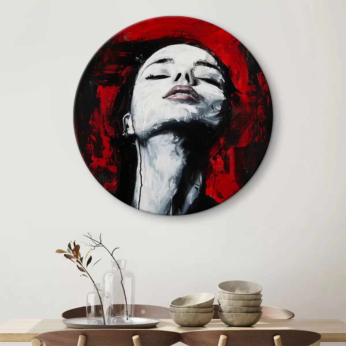 Runde Wandbilder Bild einer Frau mit geschlossenen Augen und dem Andy Warhol Museum im Hintergrund. r38557