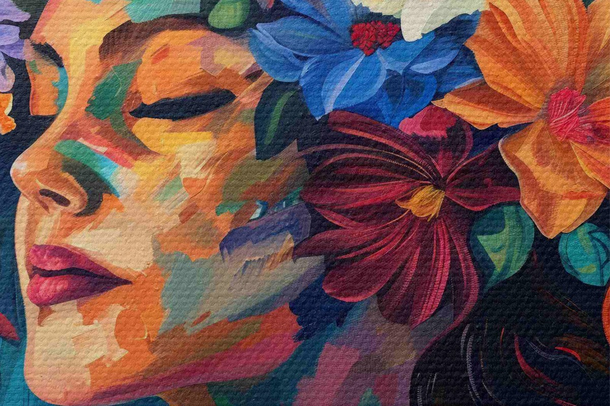Runde Wandbilder Ein Gemälde, das eine Frau mit Blumen in ihrem Haar zeigt r38574