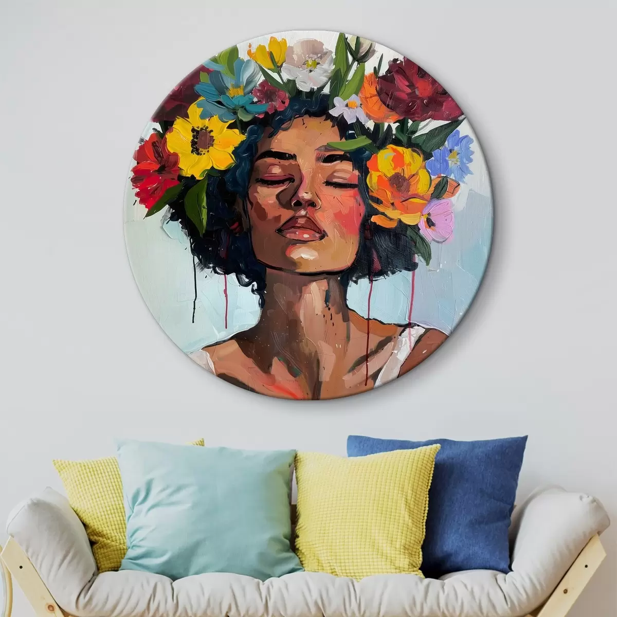 Runde Wandbilder Ein Gemälde, das eine Frau mit Blumen in ihrem Haar zeigt r38575