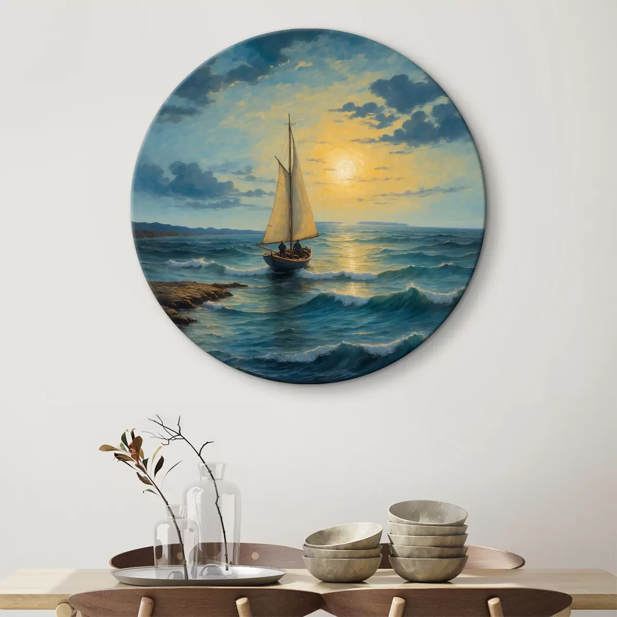 Runde Wandbilder Ein einsames Boot auf stürmischer See bei Nacht Nr r38664