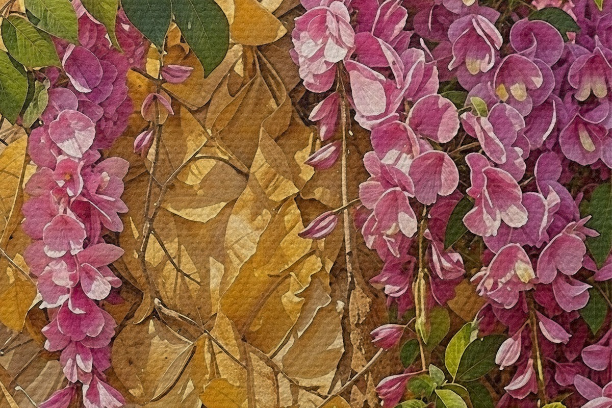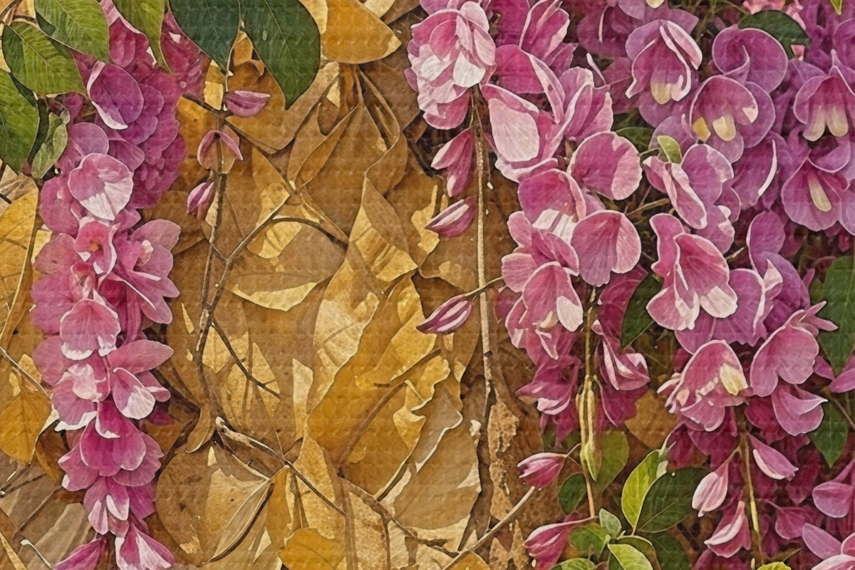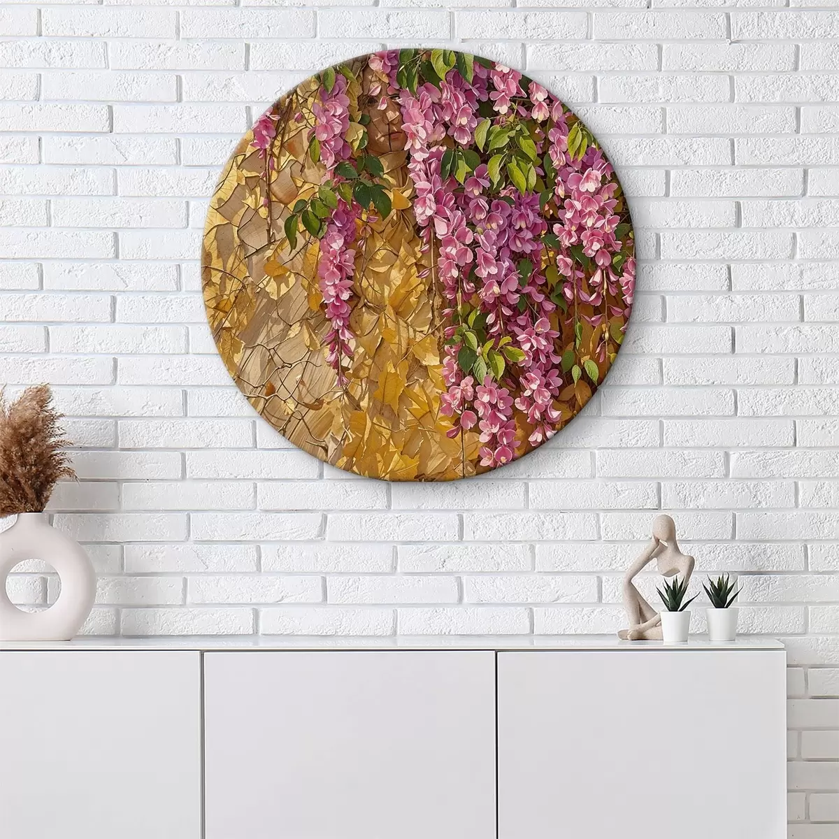 Runde Wandbilder Hängende rosa Glyzinienblüten vor einem strukturierten Hintergrund r38756