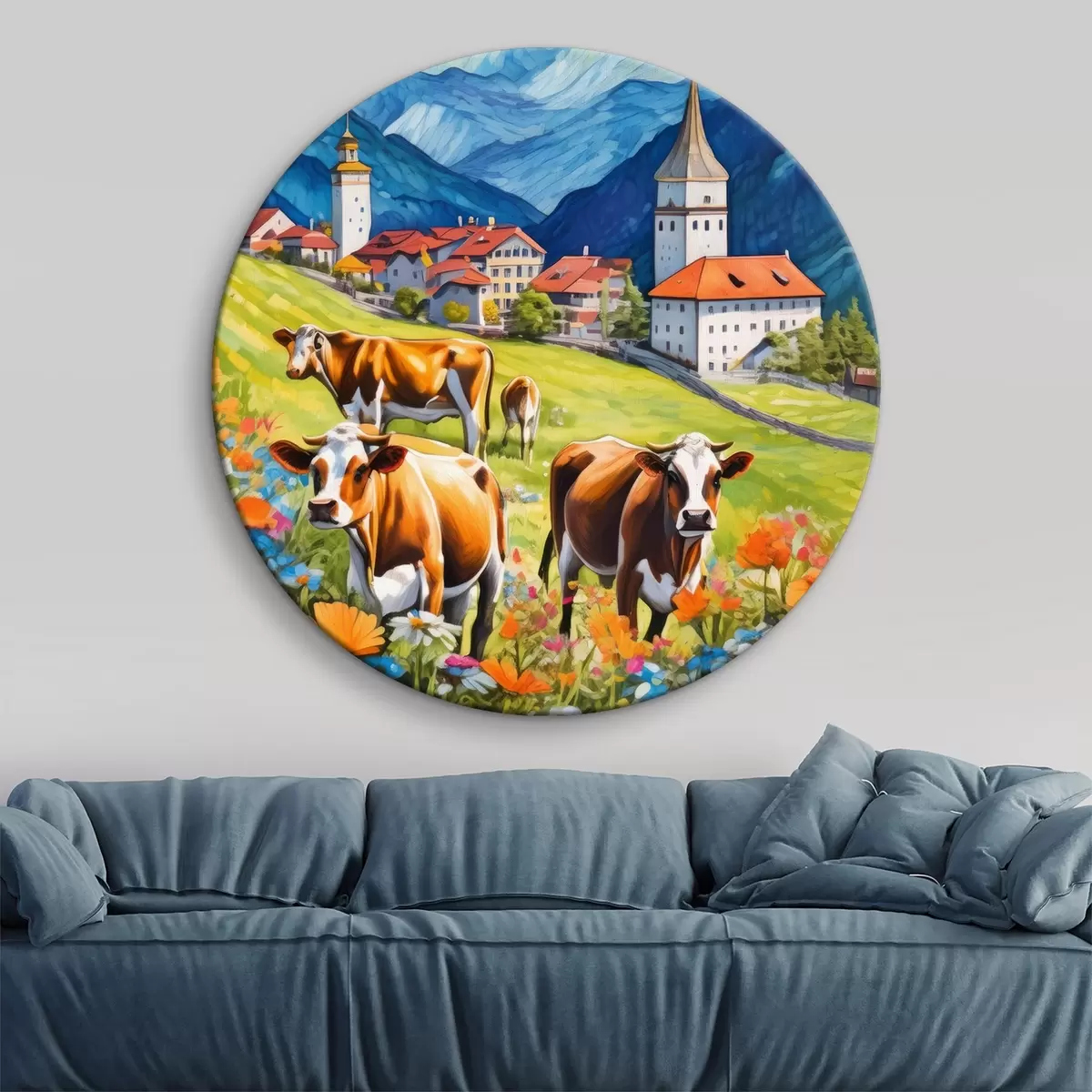 Runde Wandbilder Kühe auf einer Blumenwiese in den Alpen r38808