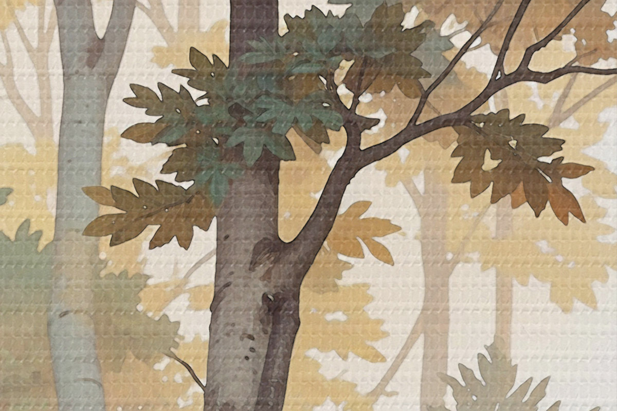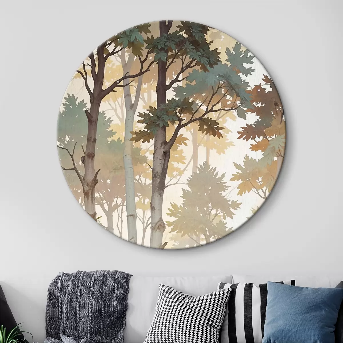 Runde Wandbilder Waldlandschaft mit hohen Bäumen in Gelb-, Orange- und Grüntönen dunstig und stimmungsvoll Nr r38828