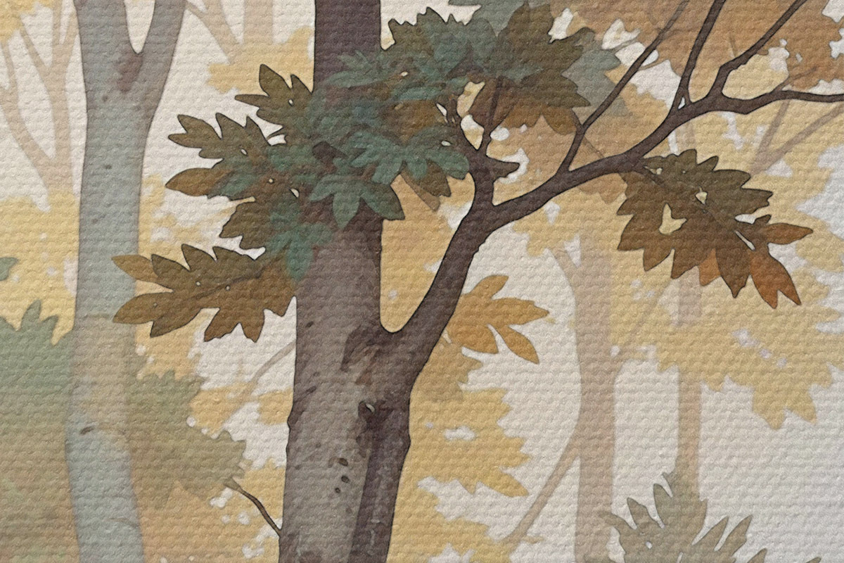 Runde Wandbilder Waldlandschaft mit hohen Bäumen in Gelb-, Orange- und Grüntönen dunstig und stimmungsvoll r38828