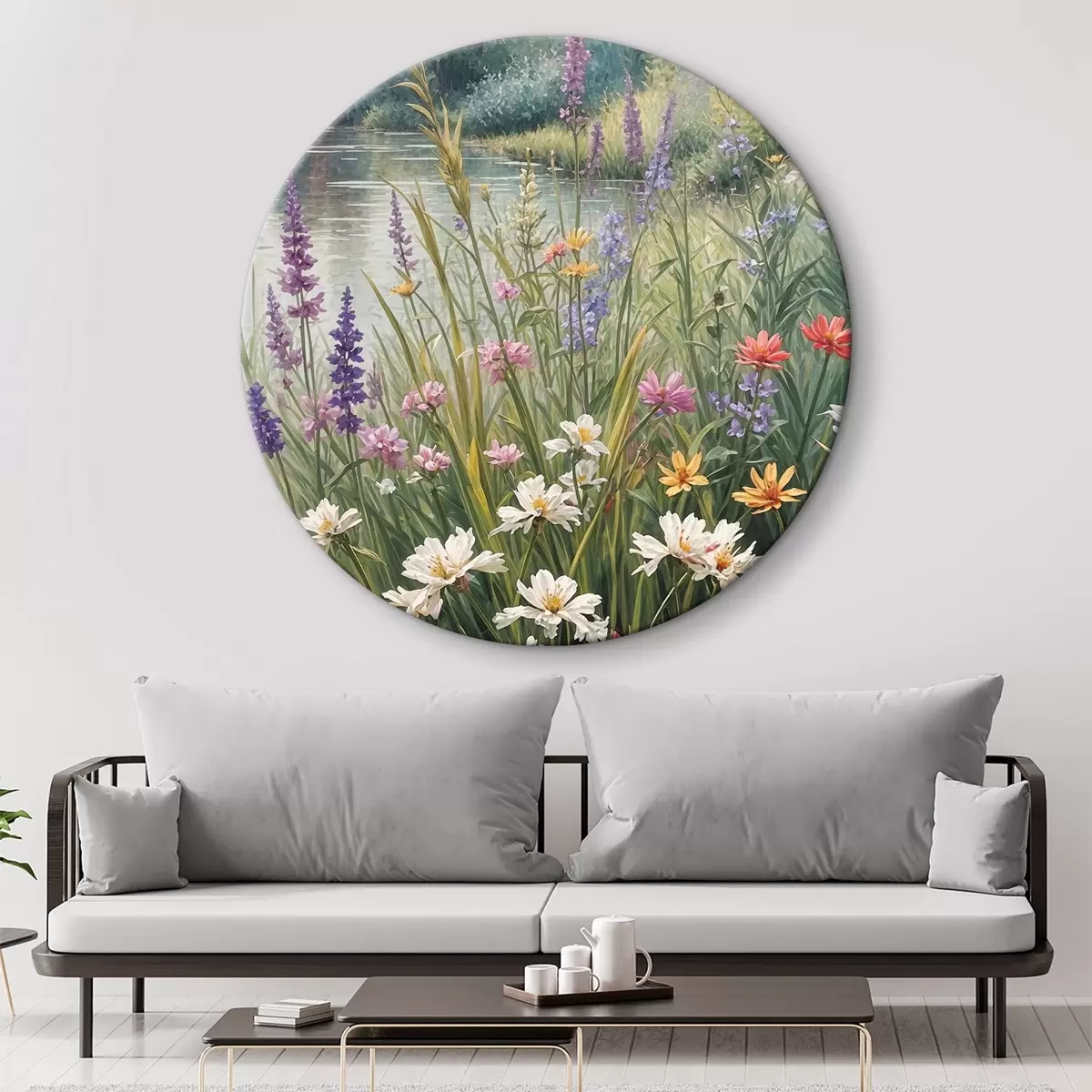 Runde Wandbilder Wildblumen und hohe Gräser. Die Gesamtszene zeigt eine lebendige, natürliche Landschaft Nr r38829