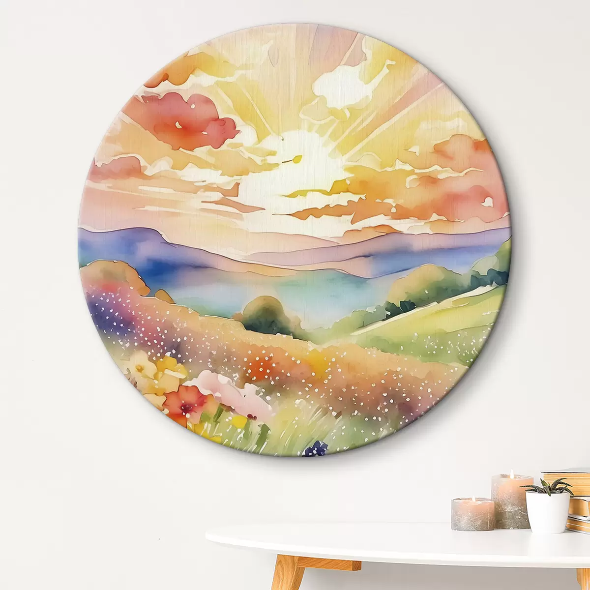 Runde Wandbilder Sonnenuntergang im Sommerfeld, Blumen, Sonne, bunter Himmel, Wolken, Natur r38842