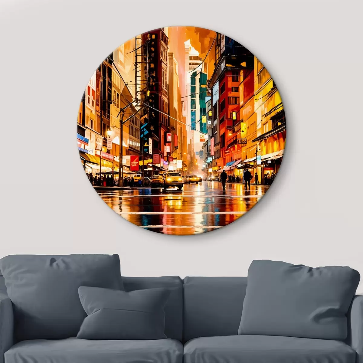 Runde Wandbilder Landschaftsgemälde einer Stadtstraße bei Nacht mit hohen Gebäuden, Neonschildern und gelben Taxis. Nr r38897