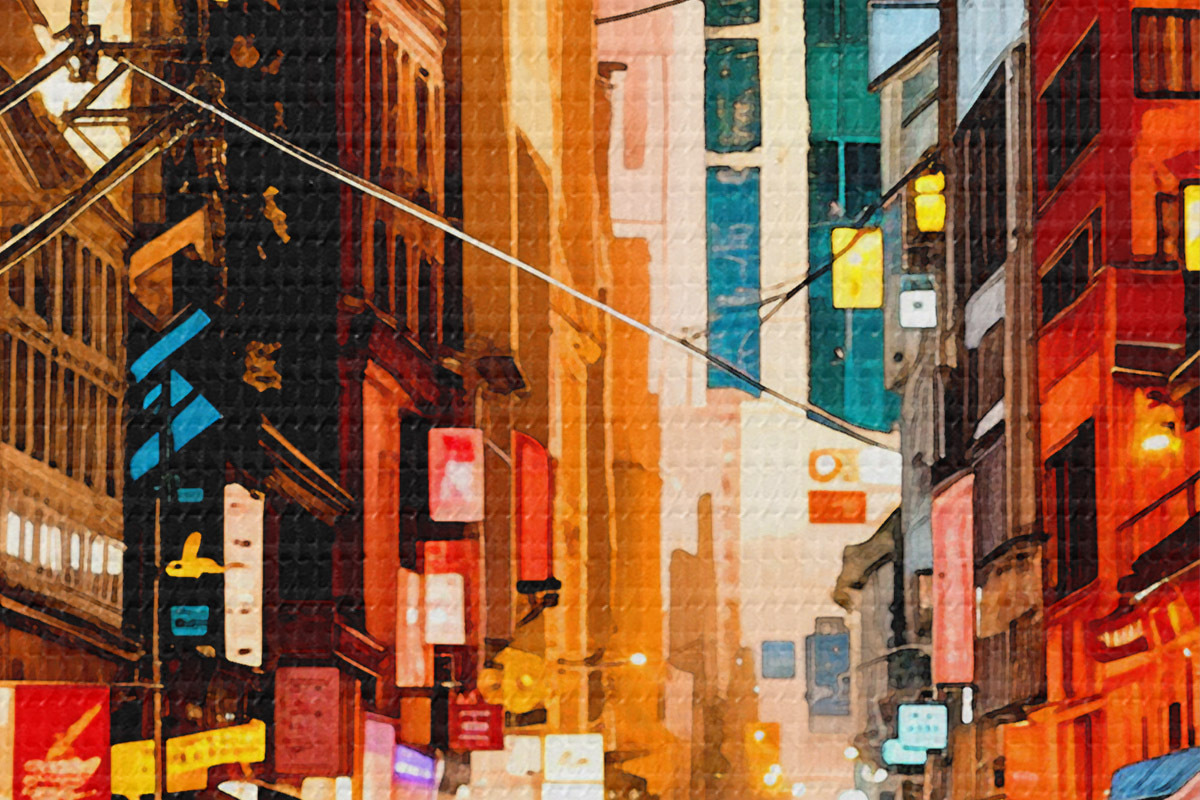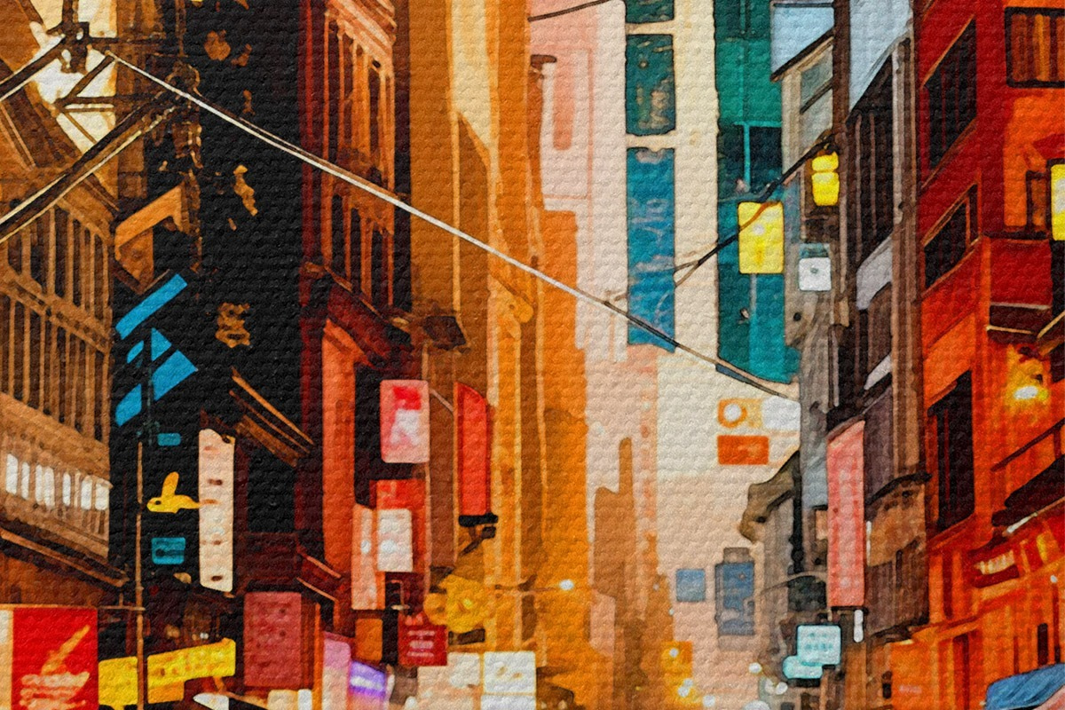 Runde Wandbilder Landschaftsgemälde einer Stadtstraße bei Nacht mit hohen Gebäuden, Neonschildern und gelben Taxis. r38897