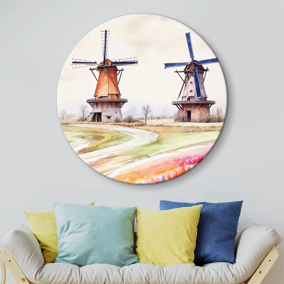 Runde Wandbilder Windmühlen in einem Tulpenfeld r38904