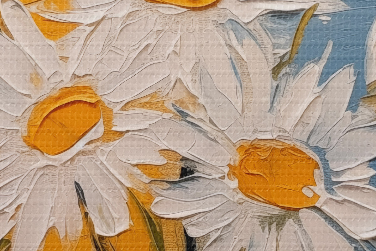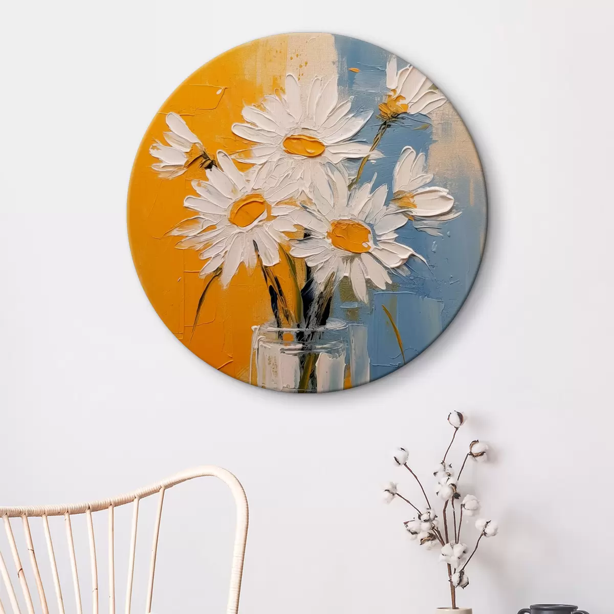 Runde Wandbilder Weiße Gänseblümchen in einer Glasvase auf blauem und gelbem Hintergrund, Imitation eines Ölgemäldes, große Striche r38907