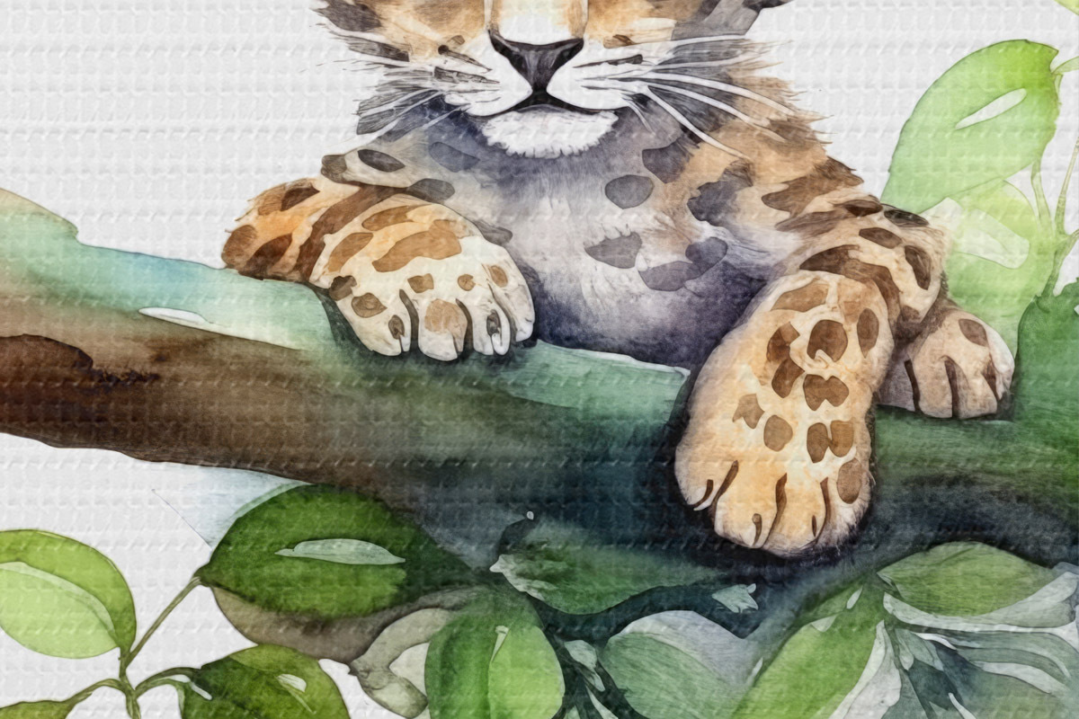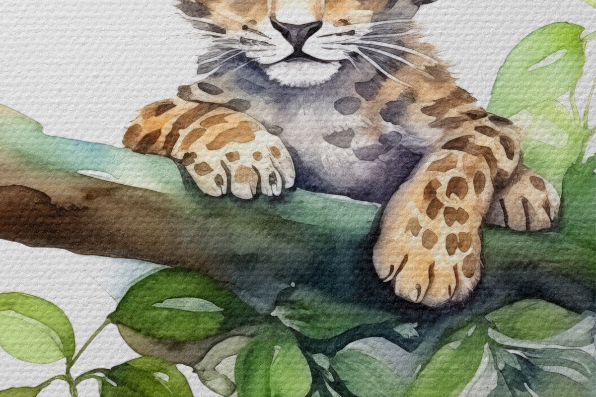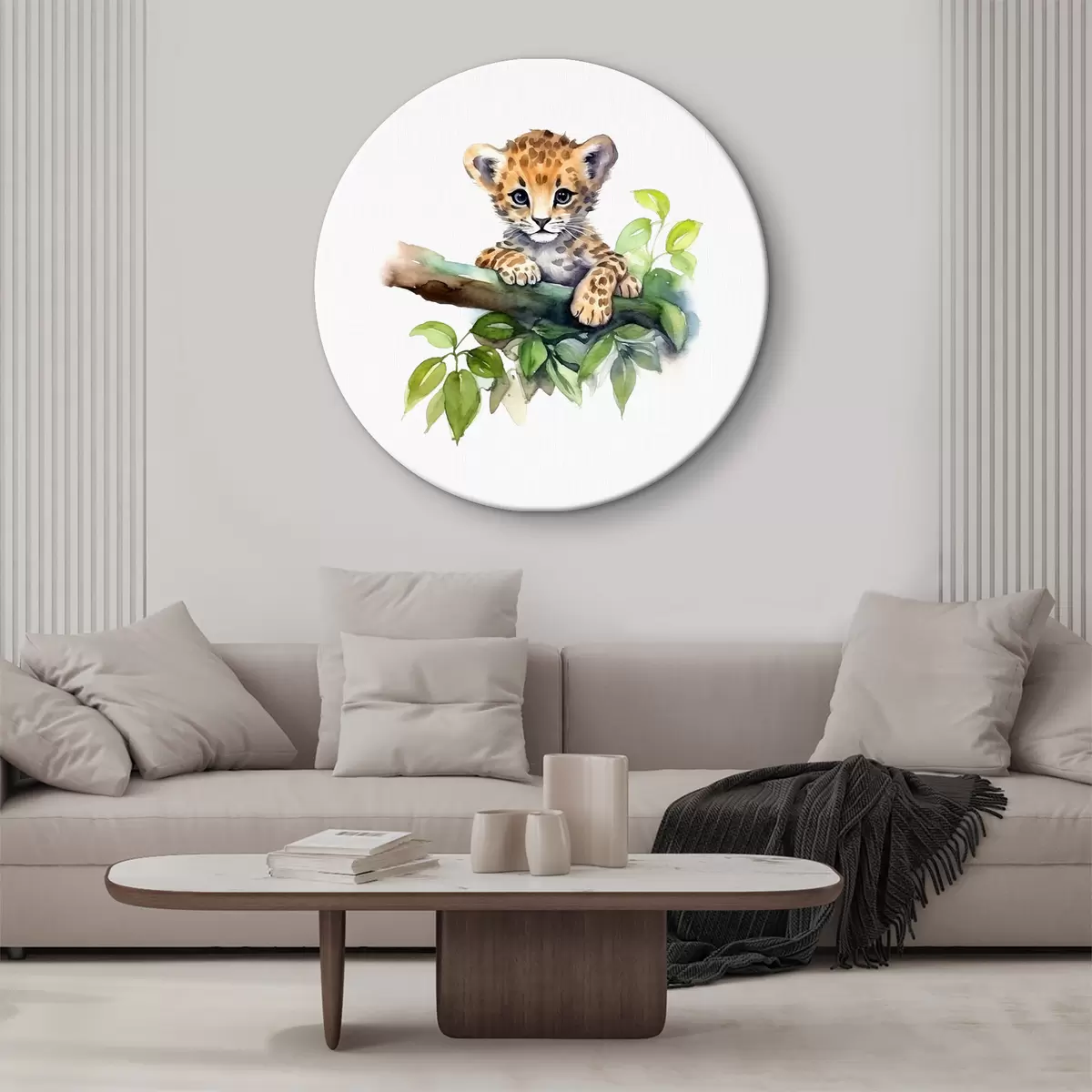 Runde Wandbilder Leopardenjunges sitzt auf einem Ast mit grünen Blättern, Tier, Aquarell r38922