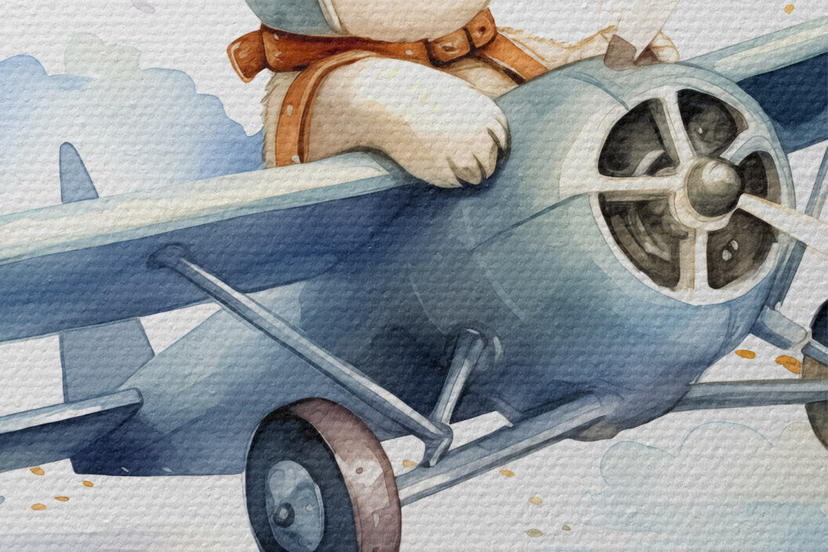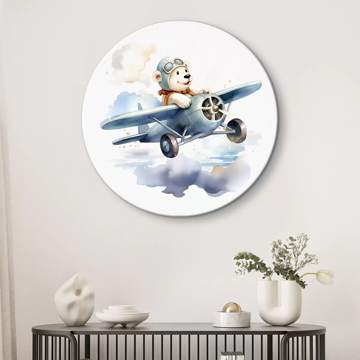 Runde Wandbilder Weißes Bärenjunges mit Brille fliegt auf einem Flugzeug Aquarell Kinderillustration r38935