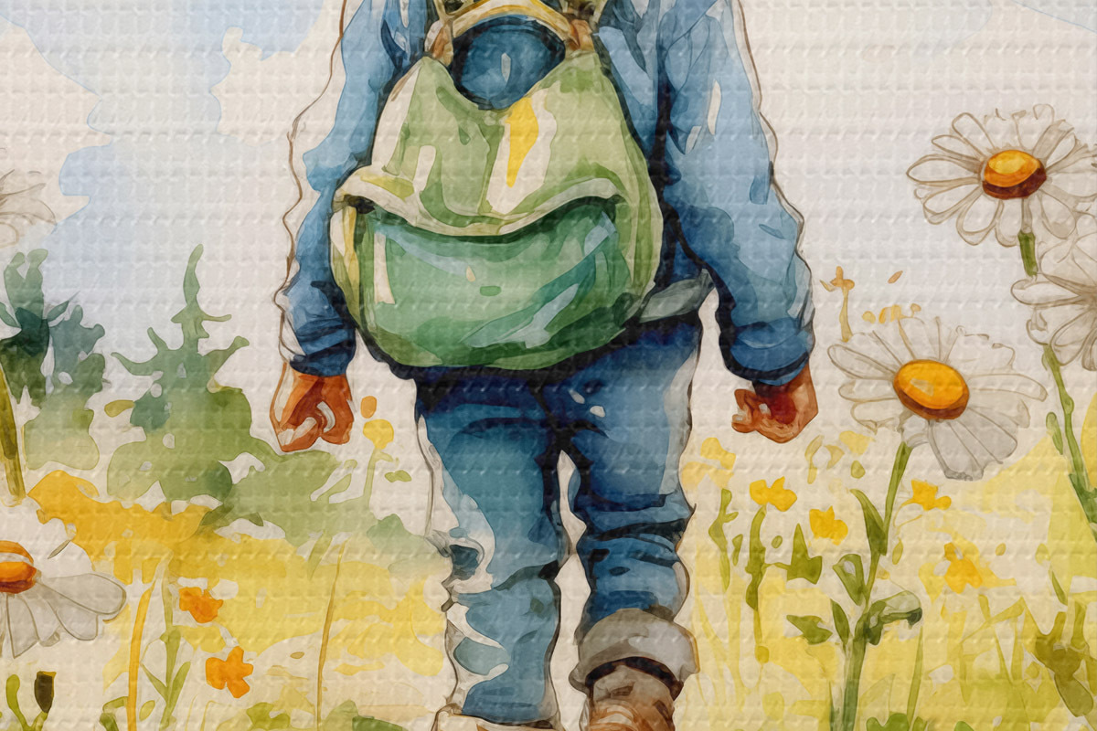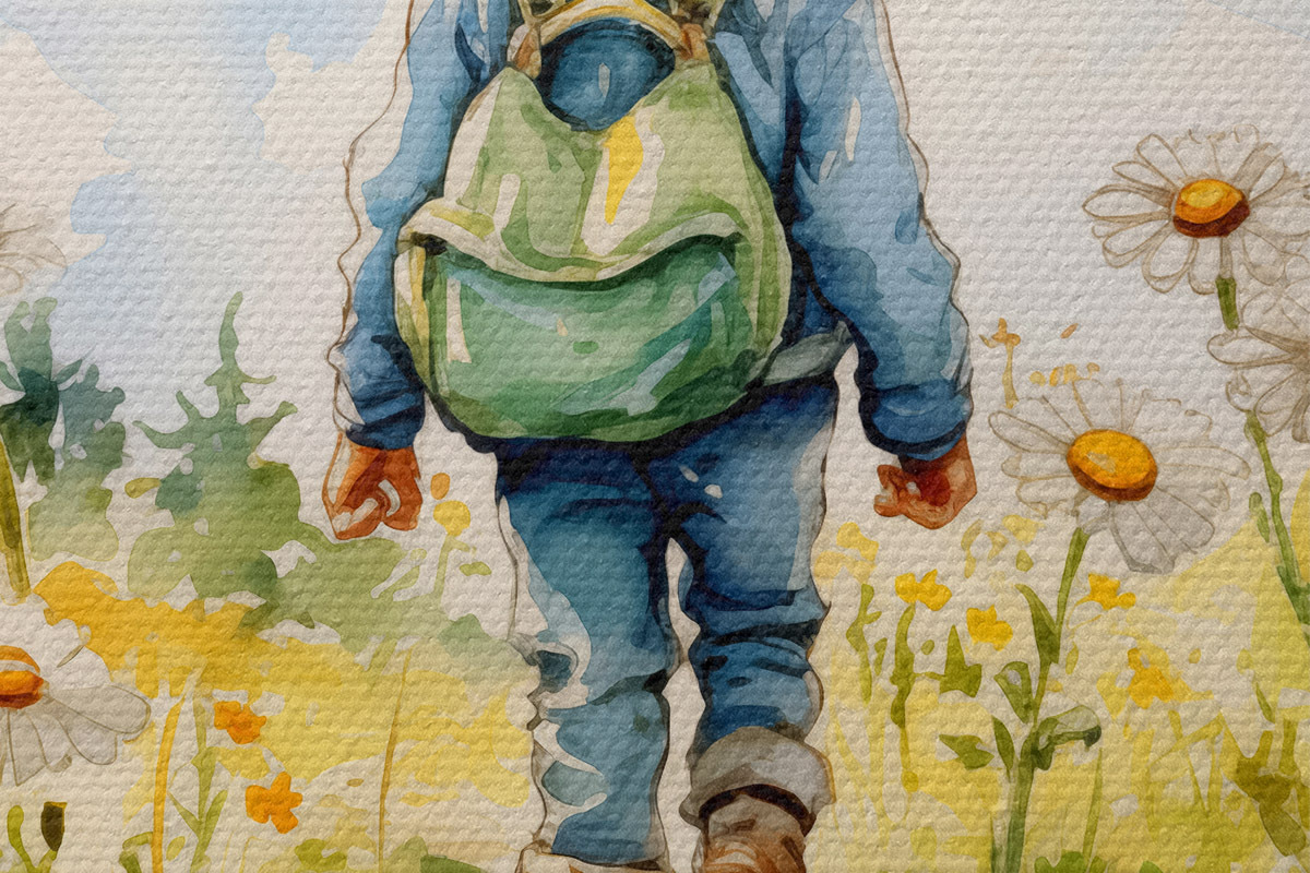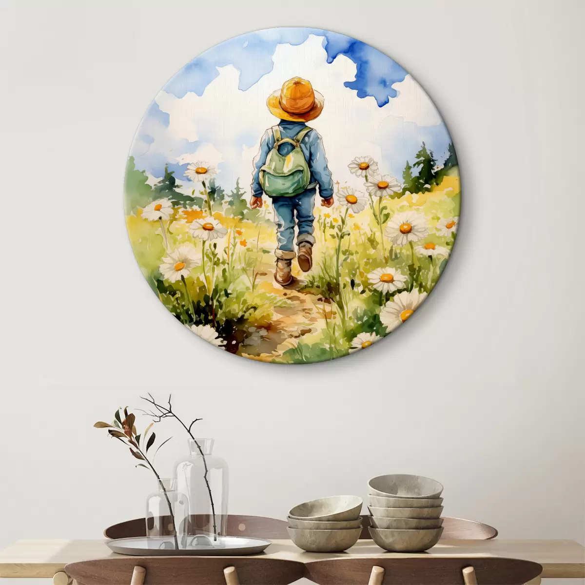 Runde Wandbilder Ein Junge mit Cowboyhut, grünem Rucksack auf dem Rücken und blauem Anzug geht einen Weg durch ein Kamillenfeld entlang, Aquarell r38946