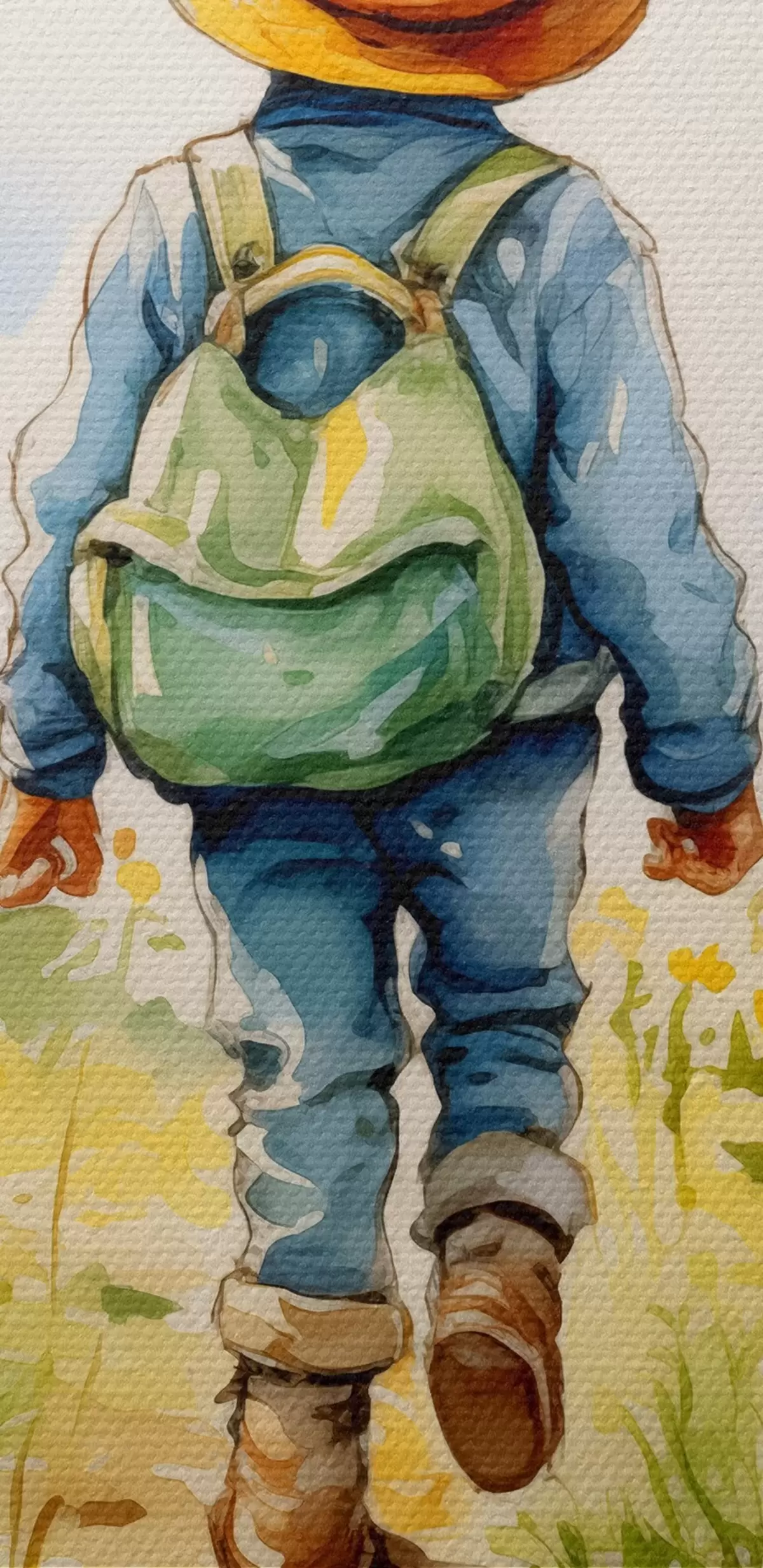 Runde Wandbilder Ein Junge mit Cowboyhut, grünem Rucksack auf dem Rücken und blauem Anzug geht einen Weg durch ein Kamillenfeld entlang, Aquarell Nr r38946