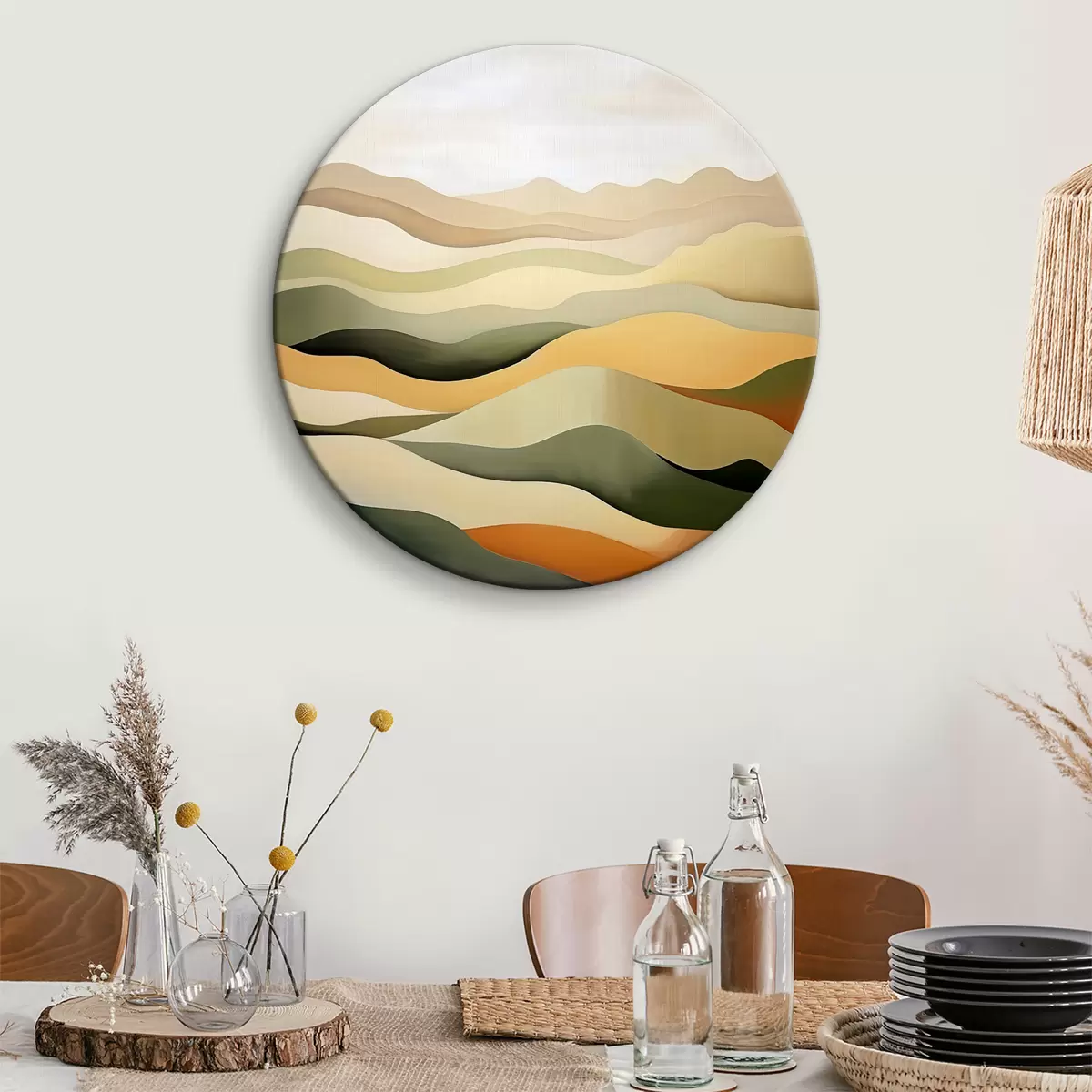Runde Wandbilder Hügel, abstrakte Landschaft, Gouache, Grün, Ocker, Sepia, Grau r38952