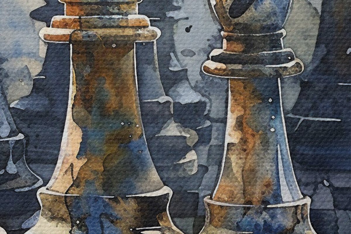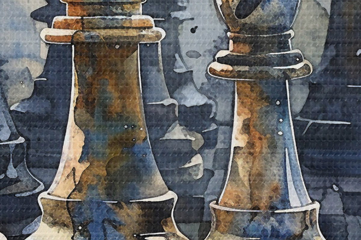 Runde Wandbilder Aquarellmalerei, Nahaufnahme eines Schachspiels aus Metall oder Stein, mit detaillierten Designs und Texturen r38960