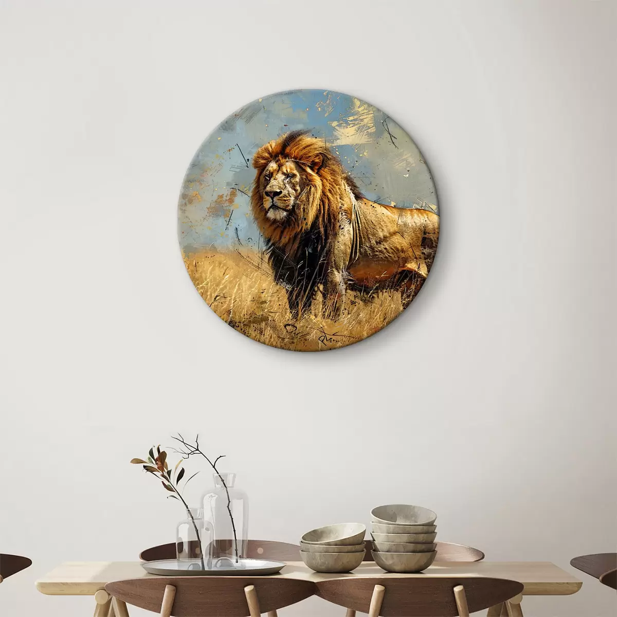 Runde Wandbilder Ein großer männlicher Löwe mit einer dicken, dunklen Mähne steht auf einer Wiese vor einem bewölkten Himmelshintergrund Nr r38962