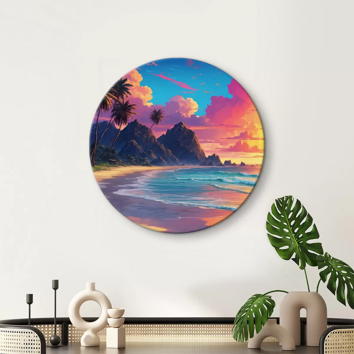 Runde Wandbilder Eine üppige, lebendige Landschaft. Sonnenuntergang am Meeresufer Nr r39009