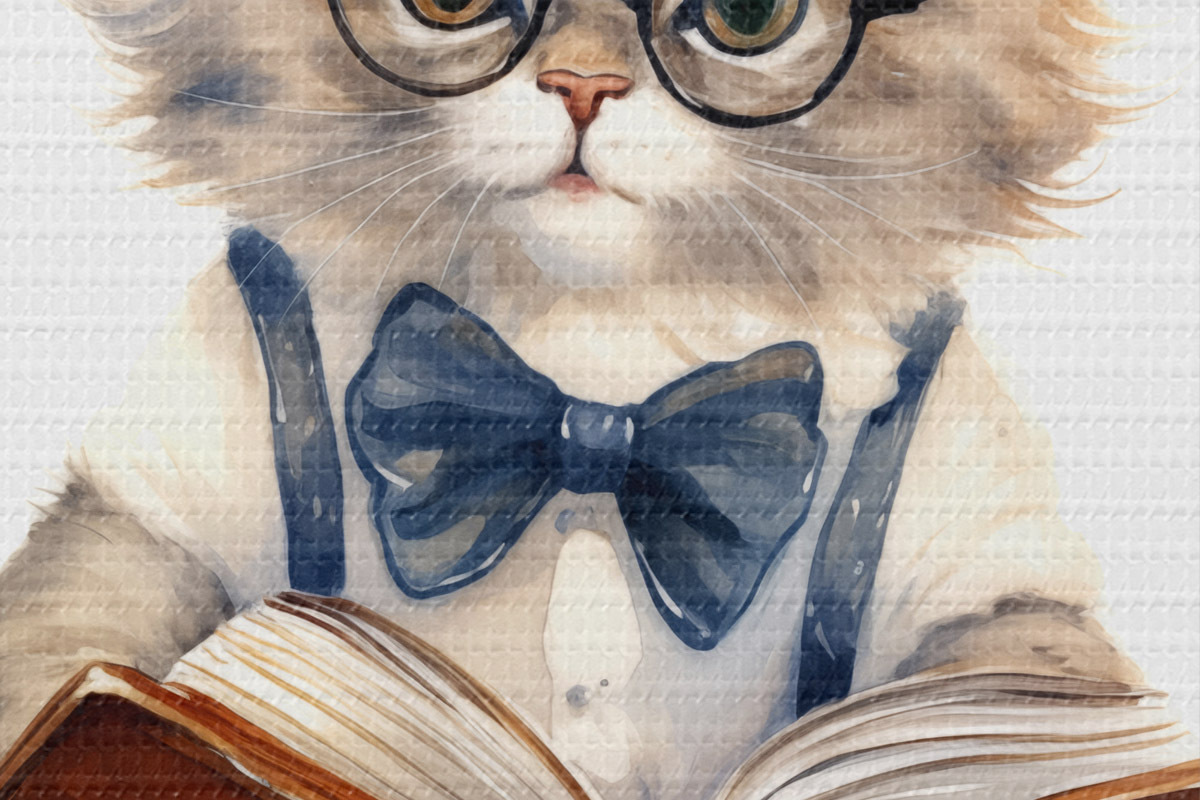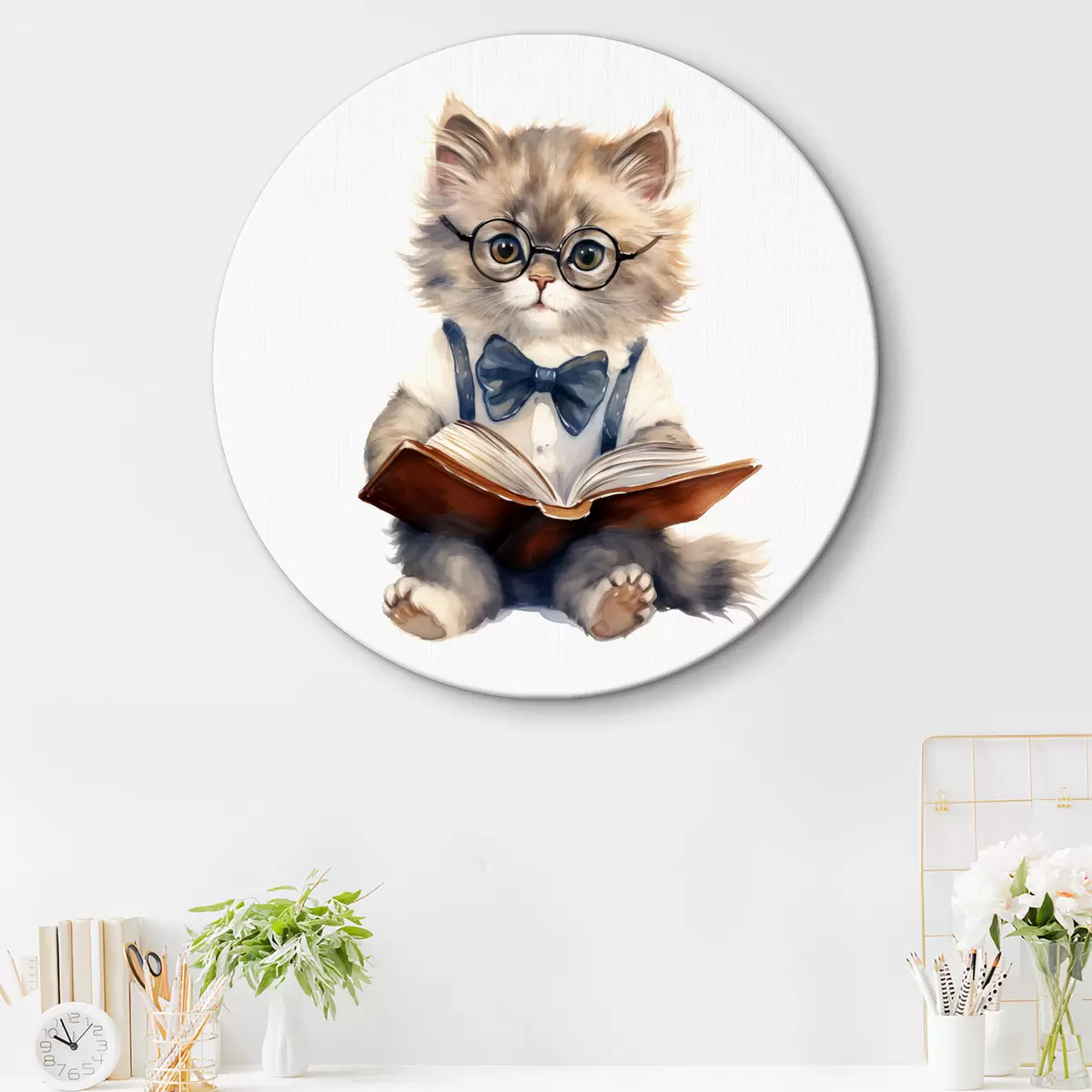 Runde Wandbilder Graues Kätzchen mit schwarzer Brille und blauem Anzug liest ein Buch-Aquarell Nr r39023