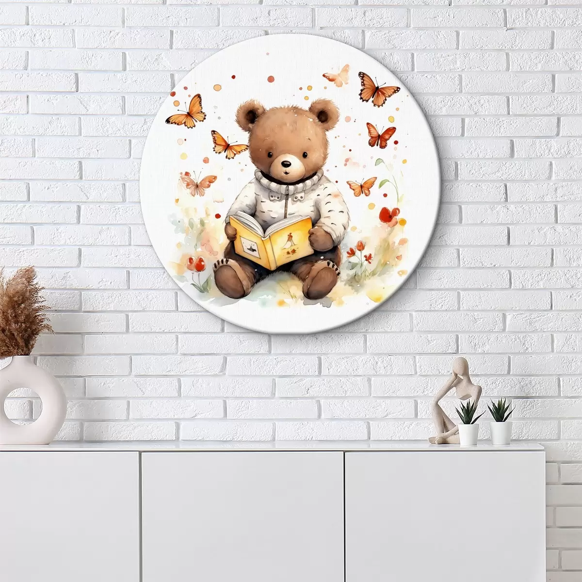 Runde Wandbilder Braunbärjunges im Pullover liest ein Buch, umgeben von Aquarell-Schmetterlingen Nr r39025