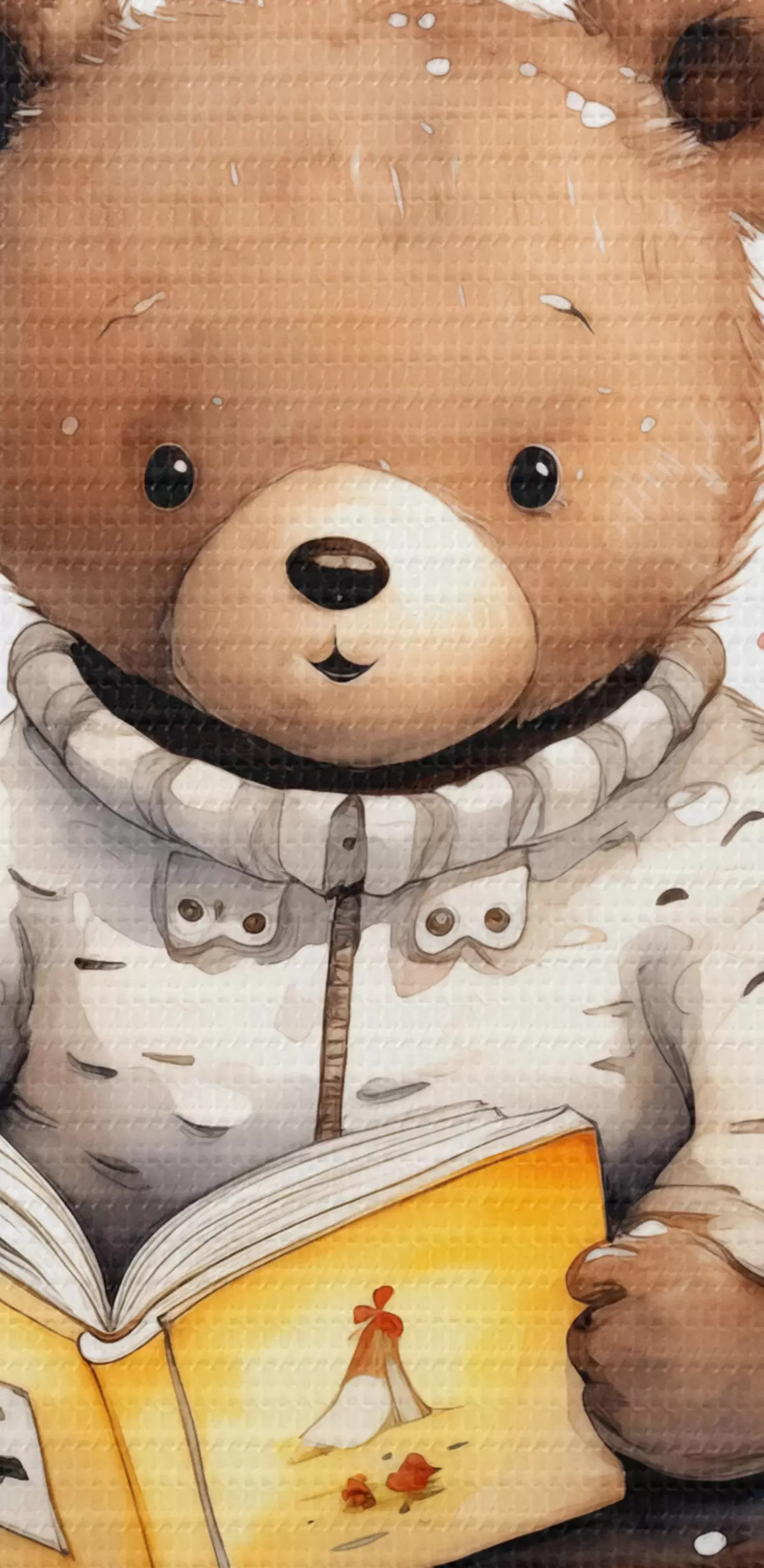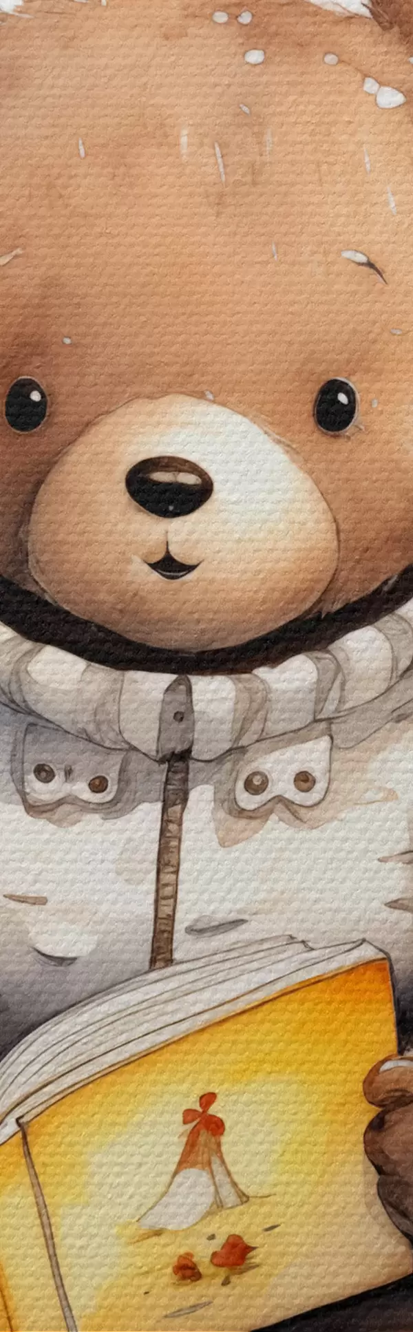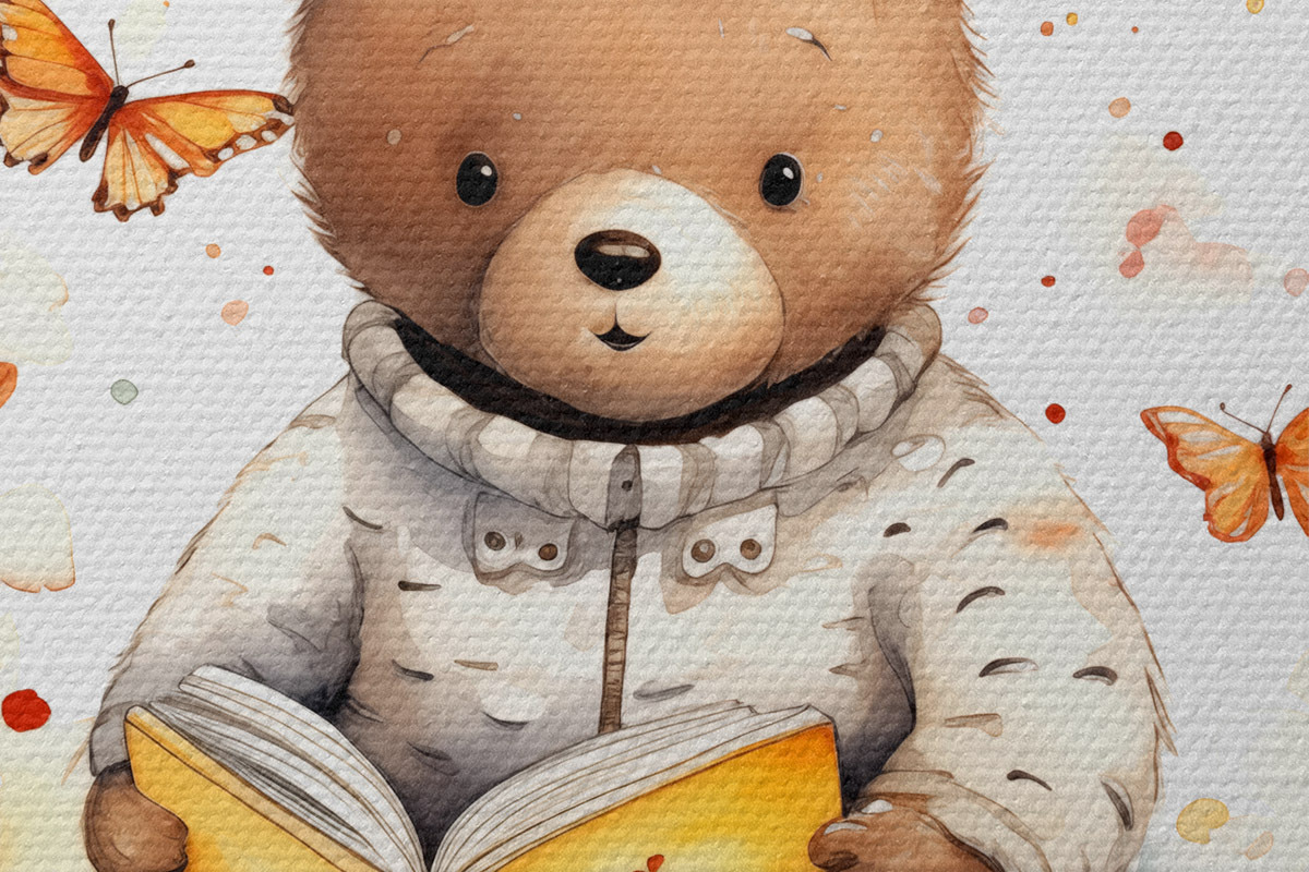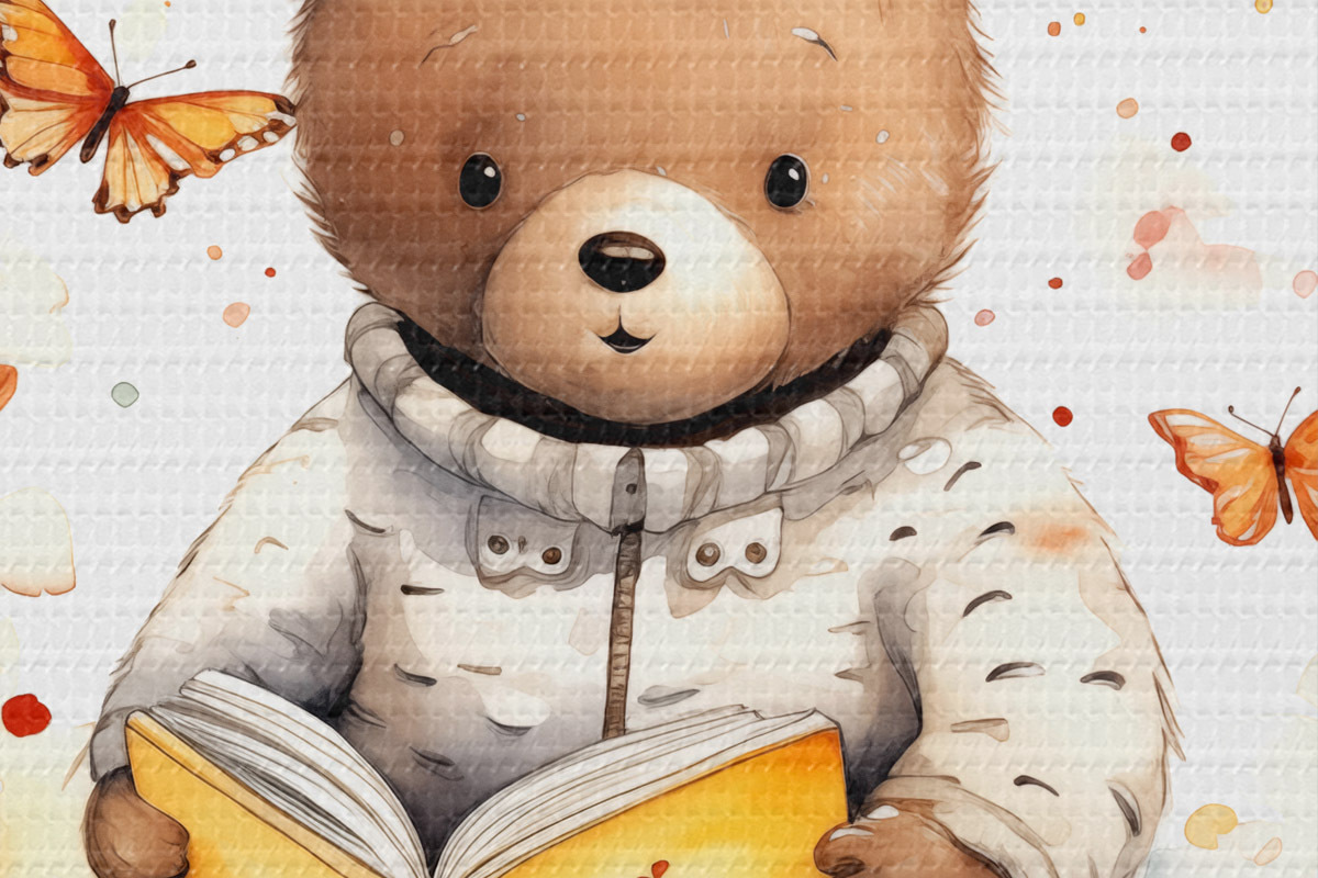 Runde Wandbilder Braunbärjunges im Pullover liest ein Buch, umgeben von Aquarell-Schmetterlingen r39025