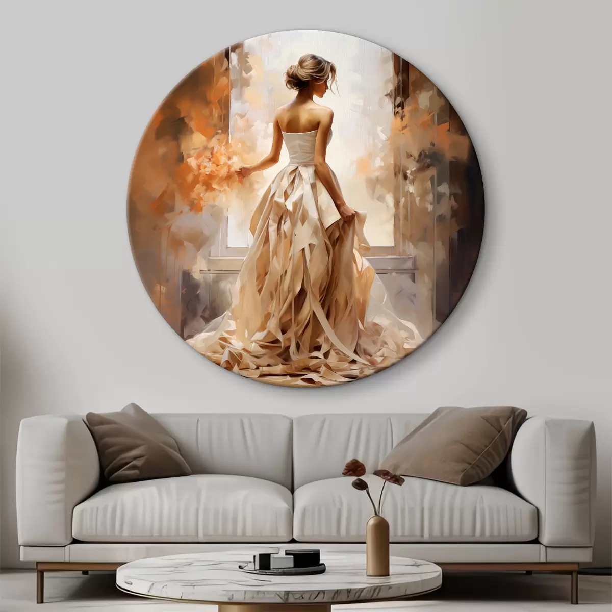 Runde Wandbilder Ein Mädchen in einem weißen langen Hochzeitskleid steht am Fenster zwischen dem Feuer und malt mit handgemachten Nr r39125